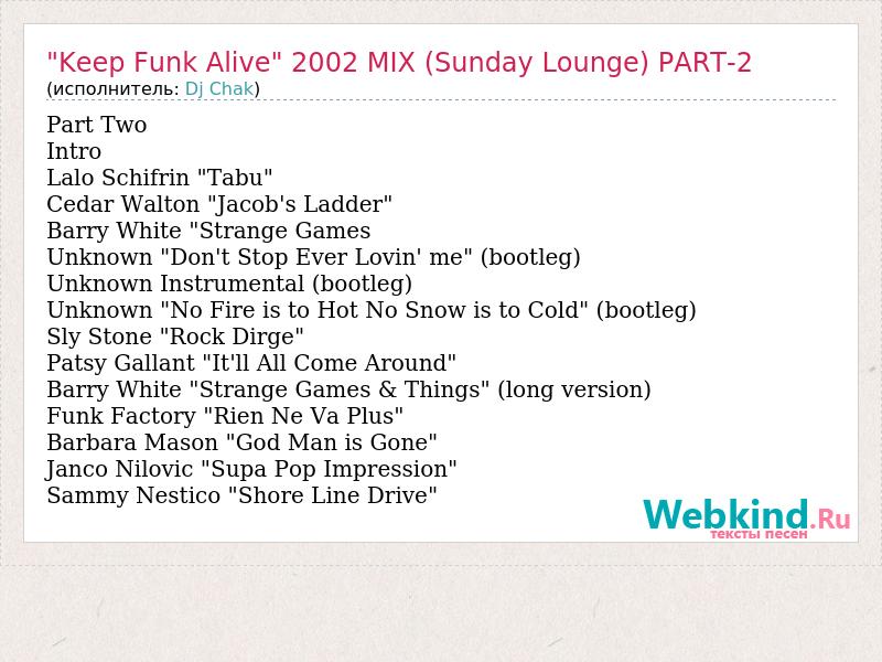 А как ты думаешь, о чем песня ""Keep Funk Alive" 2002 MIX (Sunday Lounge) PART-2" ?