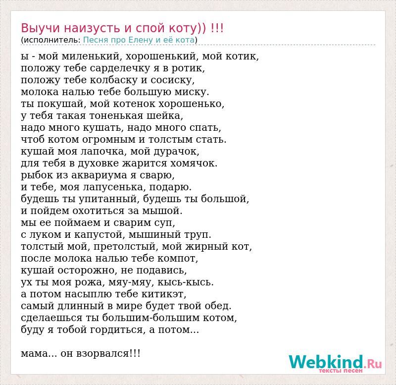 ы - мой миленький, хорошенький, мой котик, положу тебе сарделечку я в ротик, положу тебе колбаску и сосиску, молока налью тебе большую миску. ты покушай, мой котенок хорошенько, у тебя такая тоненькая шейка, надо много кушать, надо много спать, чтоб котом огромным и толстым стать. кушай моя лапочка, мой дурачок, для тебя в духовке жарится хомячок. рыбок из аквариума я сварю, и тебе, моя лапусенька, подарю. будешь ты упитанный, будешь ты большой, и пойдем охотиться за мышой. мы ее поймаем и сварим суп, с луком и капустой, мышиный труп. толстый мой, претолстый, мой жирный кот, после молока налью тебе компот, кушай осторожно, не подавись, ух ты моя рожа, мяу-мяу, кысь-кысь. а потом насыплю тебе китикэт, самый длинный в мире будет твой обед. сделаешься ты большим-большим котом, буду я тобой гордиться, а потом... мама... он взорвался!!!