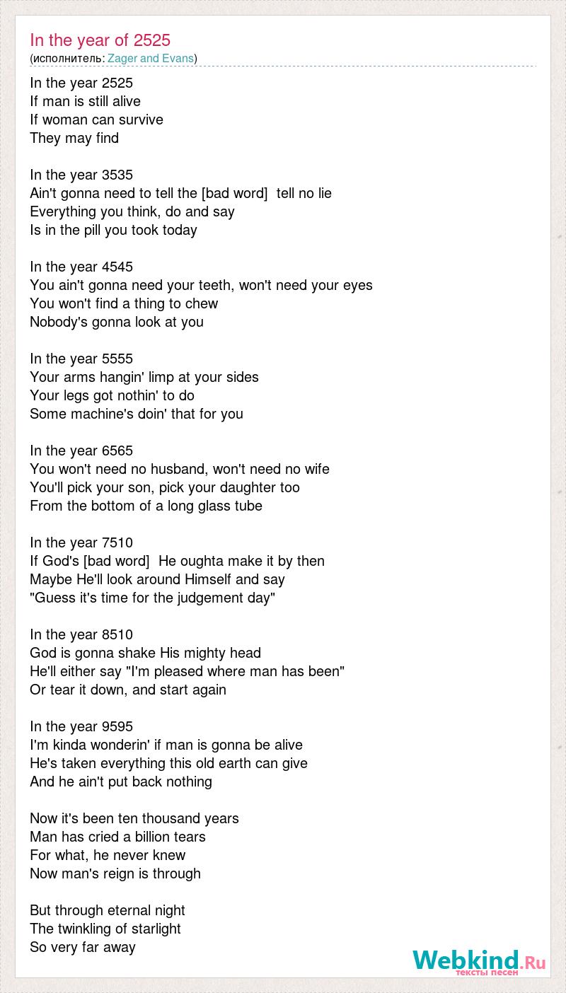 In the year 2525 If man is still alive If woman can survive They may find In the year 3535 Ain't gonna need to tell the [bad word] tell no lie Everything you think, do and say Is in the pill you took today In the year 4545 You ain't gonna need your teeth, won't need your eyes You won't find a thing to chew Nobody's gonna look at you In the year 5555 Your arms hangin' limp at your sides Your legs got nothin' to do Some machine's doin' that for you In the year 6565 You won't need no husband, won't need no wife You'll pick your son, pick your daughter too From the bottom of a long glass tube In the year 7510 If God's [bad word] He oughta make it by then Maybe He'll look around Himself and say "Guess it's time for the judgement day" In the year 8510 God is gonna shake His mighty head He'll either say "I'm pleased where man has been" Or tear it down, and start again In the year 9595 I'm kinda wonderin' if man is gonna be alive He's taken everything this old earth can give And he ain't put back nothing Now it's been ten thousand years Man has cried a billion tears For what, he never knew Now man's reign is through But through eternal night The twinkling of starlight So very far away