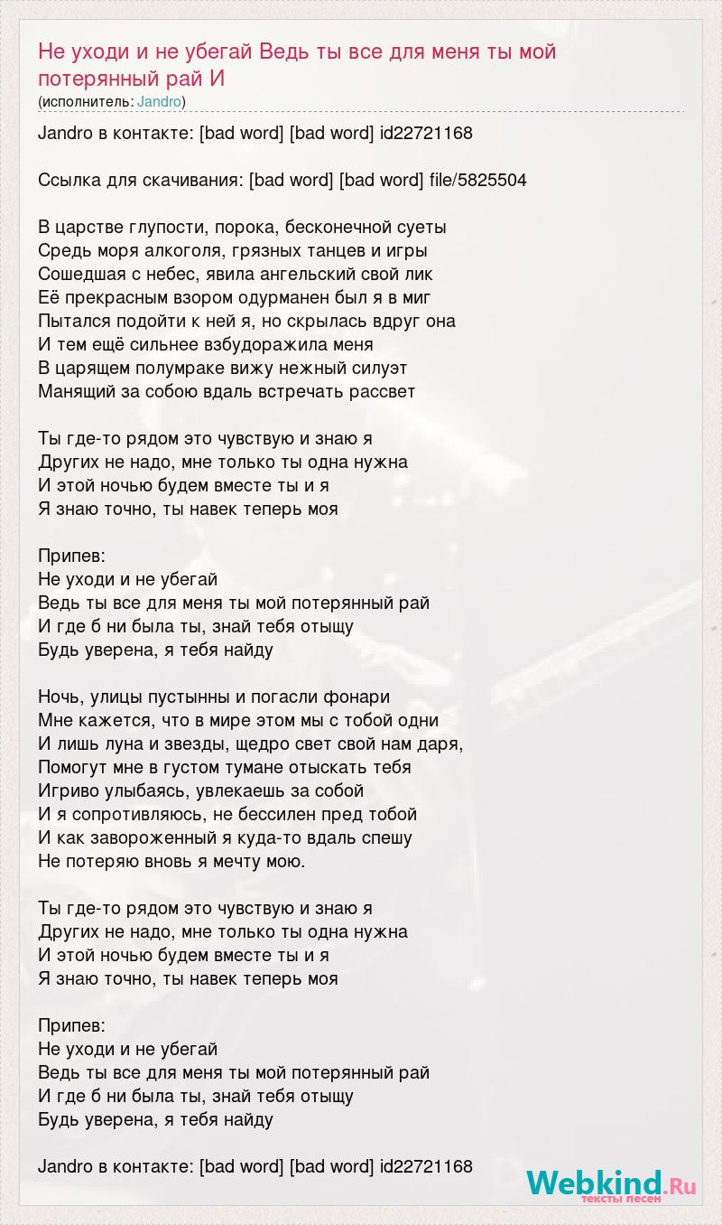 Jandro в контакте: [bad word] [bad word] id22721168 Ссылка для скачивания: [bad word] [bad word] file/5825504 В царстве глупости, порока, бесконечной суеты Средь моря алкоголя, грязных танцев и игры Сошедшая с небес, явила ангельский свой лик Её прекрасным взором одурманен был я в миг Пытался подойти к ней я, но скрылась вдруг она И тем ещё сильнее взбудоражила меня В царящем полумраке вижу нежный силуэт Манящий за собою вдаль встречать рассвет Ты где-то рядом это чувствую и знаю я Других не надо, мне только ты одна нужна И этой ночью будем вместе ты и я Я знаю точно, ты навек теперь моя Припев: Не уходи и не убегай Ведь ты все для меня ты мой потерянный рай И где б ни была ты, знай тебя отыщу Будь уверена, я тебя найду Ночь, улицы пустынны и погасли фонари Мне кажется, что в мире этом мы с тобой одни И лишь луна и звезды, щедро свет свой нам даря, Помогут мне в густом тумане отыскать тебя Игриво улыбаясь, увлекаешь за собой И я сопротивляюсь, не бессилен пред тобой И как завороженный я куда-то вдаль спешу Не потеряю вновь я мечту мою. Ты где-то рядом это чувствую и знаю я Других не надо, мне только ты одна нужна И этой ночью будем вместе ты и я Я знаю точно, ты навек теперь моя Припев: Не уходи и не убегай Ведь ты все для меня ты мой потерянный рай И где б ни была ты, знай тебя отыщу Будь уверена, я тебя найду Jandro в контакте: [bad word] [bad word] id22721168