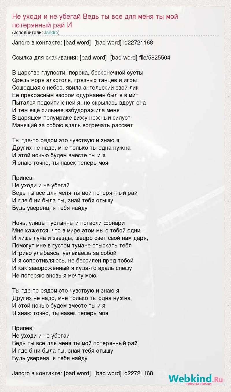 Jandro в контакте: [bad word] [bad word] id22721168 Ссылка для скачивания: [bad word] [bad word] file/5825504 В царстве глупости, порока, бесконечной суеты Средь моря алкоголя, грязных танцев и игры Сошедшая с небес, явила ангельский свой лик Её прекрасным взором одурманен был я в миг Пытался подойти к ней я, но скрылась вдруг она И тем ещё сильнее взбудоражила меня В царящем полумраке вижу нежный силуэт Манящий за собою вдаль встречать рассвет Ты где-то рядом это чувствую и знаю я Других не надо, мне только ты одна нужна И этой ночью будем вместе ты и я Я знаю точно, ты навек теперь моя Припев: Не уходи и не убегай Ведь ты все для меня ты мой потерянный рай И где б ни была ты, знай тебя отыщу Будь уверена, я тебя найду Ночь, улицы пустынны и погасли фонари Мне кажется, что в мире этом мы с тобой одни И лишь луна и звезды, щедро свет свой нам даря, Помогут мне в густом тумане отыскать тебя Игриво улыбаясь, увлекаешь за собой И я сопротивляюсь, не бессилен пред тобой И как завороженный я куда-то вдаль спешу Не потеряю вновь я мечту мою. Ты где-то рядом это чувствую и знаю я Других не надо, мне только ты одна нужна И этой ночью будем вместе ты и я Я знаю точно, ты навек теперь моя Припев: Не уходи и не убегай Ведь ты все для меня ты мой потерянный рай И где б ни была ты, знай тебя отыщу Будь уверена, я тебя найду Jandro в контакте: [bad word] [bad word] id22721168