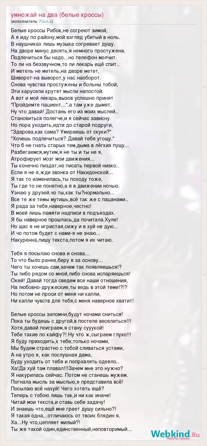 Белые кроссы Рибок,не согреют зимой, А я иду по району,мой взгляд убитый в ноль. В наушниках лишь музыка согревает душу. На дворе минус десять,я немного простужена. Подлечиться бы надо...но телефон молчит. То ли на беззвучном,то ли лекарь ещё спит.. И метель не метель,на дворе метет, Шиворот-на выворот,у нас наоборот. Снова чувства простужены и больны тобой, Эти карусели крутят мысли напостой. А вот и мой лекарь,вызов успешно принят "Пройдемте пациент...",а там уже дымят. Ну что давай! Достань его из моих мыслей.. Становиться полегче,и я сейчас зависну. Но пора уходить,идти до старой подруги, "Здарова,как сама? Умираешь от скуки?" "Хочешь подлечиться? Давай тебя угощу." Что б не гнать старых тем,дыма в лёгких пущу... Разбегаемся,мутим,я не ты и ты не я, Атрофирует мозг мои движения... Ты конечно пиздат,но писать первой низко.. Если я не я,жди звонка от Накидонской... Я так то изменилась,ты походу тоже, Ты где то не понятно,а я в движении ночью. Узнаю у друзей,чо ты,как ты?нормально... Все те же темы мутишь,всё так же с пацанами.. Я рада за тебя,наверное,честно! В моей лишь памяти надписи в подъездах. Я бы наверное прошлась,да почитала.Хуле! Но щас я не игристая,сижу и в хуй не дую... И чо потом будет с нами-я не знаю... Накуренна,пишу текста,потом я их читаю. Тебя я посылаю снова и снова... То что было ранее,беру я за основу... Чего ты хочешь сам,зачем так появляешься!? Ты либо рядом со мной,либо снова испаряешься! Окей! Давай тогда сведем все наши отношения, На любовно-дружеские,ты ведь в этой теме!?!? Но потом не проси от меня ни капли, Ни капли чувств для тебя,с меня наверное хватит! Белые кроссы запомни,будут ночами сниться! Пока ты будешь с другой,в постеле веселиться!!! Хотя,давай поиграем,я стану сууукой! Тебе такие по кайфу?! Ну что ж,сыграем глухо!!! Я буду приходить,к тебе,только ночами, Мы будем страстно с тобой сливаться устами, А на утро я, как послушная дама, Буду уходить от тебя и поправлять одеяло.. Ха!Да хуй там плавал!!!Зачем мне это нужно? Я накурилась сейчас. Потом не станешь мужем. Погнала мысль за мыслью,я представила всё! Посылаю всё нахуй! Чего хотеть ещё? Теперь с тобою лишь так,и ни как иначе! Читай мои текста,и ставь себе задачу! И знаешь что,ещё мне греет душу сильно?! Я такая одна...отличаюсь от твоих блядин я. Ха...Ну что,цепляет милый?! Ты же такой один,единственный,неповторимый...