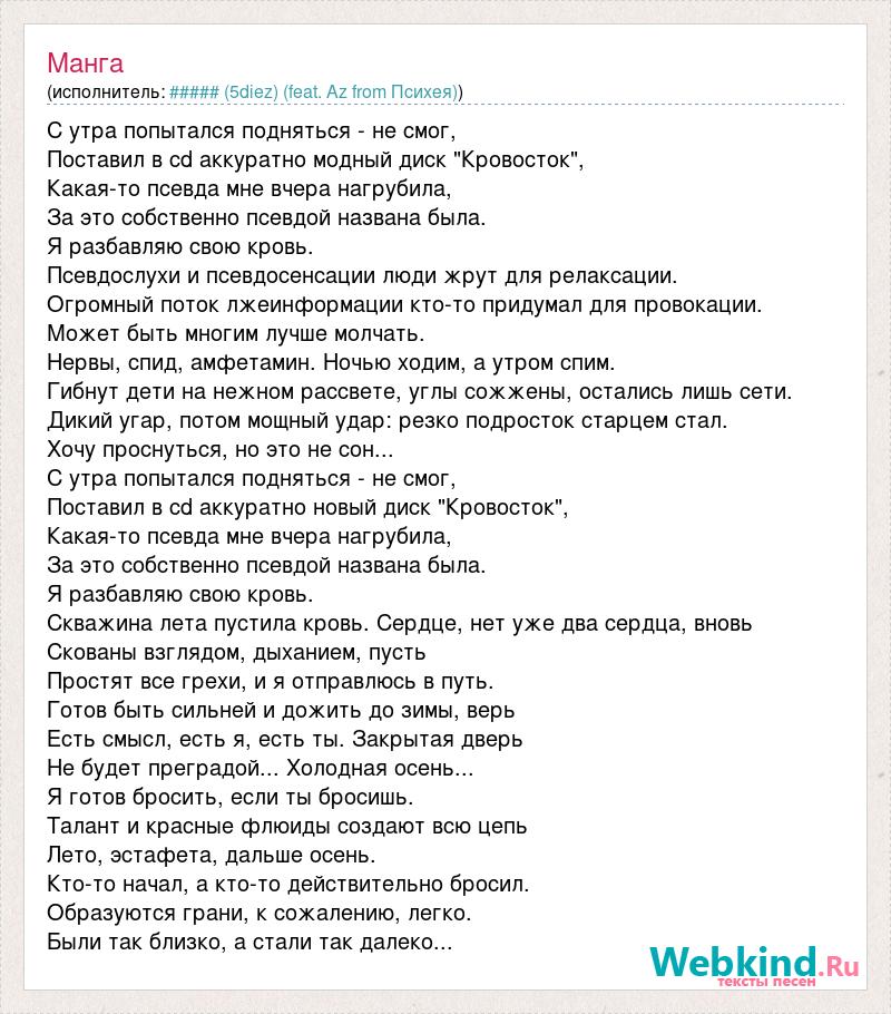 С утра попытался подняться - не смог, Поставил в cd аккуратно модный диск "Кровосток", Какая-то псевда мне вчера нагрубила, За это собственно псевдой названа была. Я разбавляю свою кровь. Псевдослухи и псевдосенсации люди жрут для релаксации. Огромный поток лжеинформации кто-то придумал для провокации. Может быть многим лучше молчать. Нервы, спид, амфетамин. Ночью ходим, а утром спим. Гибнут дети на нежном рассвете, углы сожжены, остались лишь сети. Дикий угар, потом мощный удар: резко подросток старцем стал. Хочу проснуться, но это не сон... С утра попытался подняться - не смог, Поставил в cd аккуратно новый диск "Кровосток", Какая-то псевда мне вчера нагрубила, За это собственно псевдой названа была. Я разбавляю свою кровь. Скважина лета пустила кровь. Сердце, нет уже два сердца, вновь Скованы взглядом, дыханием, пусть Простят все грехи, и я отправлюсь в путь. Готов быть сильней и дожить до зимы, верь Есть смысл, есть я, есть ты. Закрытая дверь Не будет преградой... Холодная осень... Я готов бросить, если ты бросишь. Талант и красные флюиды создают всю цепь Лето, эстафета, дальше осень. Кто-то начал, а кто-то действительно бросил. Образуются грани, к сожалению, легко. Были так близко, а стали так далеко...
