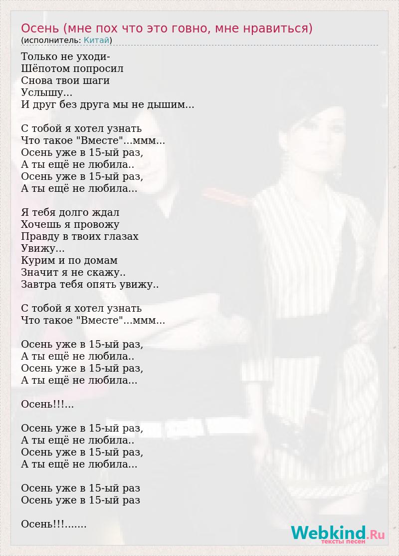 Только не уходи- Шёпотом попросил Снова твои шаги Услышу... И друг без друга мы не дышим... С тобой я хотел узнать Что такое "Вместе"...ммм... Осень уже в 15-ый раз, А ты ещё не любила.. Осень уже в 15-ый раз, А ты ещё не любила... Я тебя долго ждал Хочешь я провожу Правду в твоих глазах Увижу... Курим и по домам Значит я не скажу.. Завтра тебя опять увижу.. С тобой я хотел узнать Что такое "Вместе"...ммм... Осень уже в 15-ый раз, А ты ещё не любила.. Осень уже в 15-ый раз, А ты ещё не любила... Осень!!!... Осень уже в 15-ый раз, А ты ещё не любила.. Осень уже в 15-ый раз, А ты ещё не любила... Осень уже в 15-ый раз Осень уже в 15-ый раз Осень!!!.......