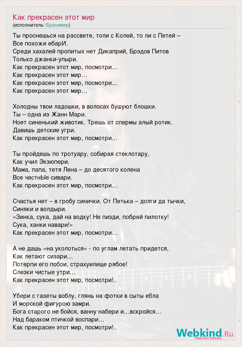 Ты проснешься на рассвете, толи с Колей, то ли с Петей – Все похожи ебарИ. Среди хахалей пропитых нет Дикаприй, Брэдов Питов Только джанки-упыри. Как прекрасен этот мир, посмотри… Как прекрасен этот мир… Как прекрасен этот мир, посмотри… Как прекрасен этот мир… Холодны твои ладошки, в волосах бушуют блошки. Ты – одна из Жанн Мари. Ноет синенький животик. Трешь от спермы алый ротик. Давишь детские угри. Как прекрасен этот мир, посмотри… Ты пройдешь по тротуару, собирая стеклотару, Как учил Экзюпери. Мама, папа, тетя Лена – до десятого колена Все честнЫе сивари. Как прекрасен этот мир, посмотри… Счастья нет – в гробу синички. От Петька – долги да тычки, Синяки и волдыри. «Зинка, сука, дай на водку! Не пизди, побрей пилотку! Сука, ханки навари!» Как прекрасен этот мир, посмотри… А не дашь «на уколоться» - по углам летать придется, Как летают сизари… Потерпи его побои, страхуилище рябое! Слезки чистые утри… Как прекрасен этот мир, посмотри!.. Убери с газеты воблу, глянь на фотки в сыты ебла И морской фигурою замри. Бога старого не бойся, ванну набери и…вскройся… Над бараком птичкой воспари… Как прекрасен этот мир, посмотри!..
