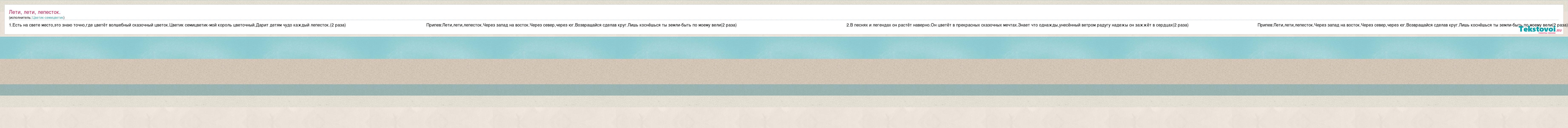 1.Есть на свете место,это знаю точно,где цветёт волшебный сказочный цветок.Цветик семицветик-мой король цветочный.Дарит детям чудо каждый лепесток.(2 раза) Припев:Лети,лети,лепесток.Через запад на восток.Через север,через юг.Возвращайся сделав круг.Лишь коснёшься ты земли-быть по моему вели(2 раза) 2.В песнях и легендах он растёт наверно.Он цветёт в прекрасных сказочных мечтах.Знает что однажды,унесённый ветром радугу надежы он зажжёт в сердцах(2 раза) Припев:Лети,лети,лепесток.Через запад на восток.Через север,через юг.Возвращайся сделав круг.Лишь коснёшься ты земли-быть по моему вели(2 раза)