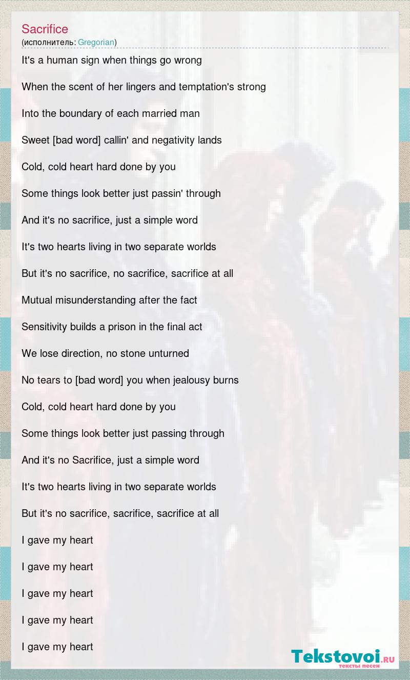 It's a human sign when things go wrong When the scent of her lingers and temptation's strong Into the boundary of each married man Sweet deceit comes callin' and negativity lands Cold, cold heart hard done by you Some things look better just passin' through And it's no sacrifice, just a simple word It's two hearts living in two separate worlds But it's no sacrifice, no sacrifice, sacrifice at all Mutual misunderstanding after the fact Sensitivity builds a prison in the final act We lose direction, no stone unturned No tears to [bad word] you when jealousy burns Cold, cold heart hard done by you Some things look better just passing through And it's no Sacrifice, just a simple word It's two hearts living in two separate worlds But it's no sacrifice, sacrifice, sacrifice at all I gave my heart I gave my heart I gave my heart I gave my heart I gave my heart