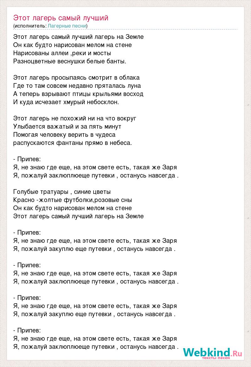 Этот лагерь самый лучший лагерь на Земле Он как будто нарисован мелом на стене Нарисованы аллеи ,реки и мосты Разноцветные веснушки белые банты. Этот лагерь просыпаясь смотрит в облака Где то там совсем недавно пряталась луна А теперь взрывают птицы крыльями восход И куда исчезает хмурый небосклон. Этот лагерь не похожий ни на что вокруг Улыбается важатый и за пять минут Помогая человеку верить в чудеса распускаются фантаны прямо в небеса. - Припев: Я, не знаю где еще, на этом свете есть, такая же Заря Я, пожалуй заклюплюеще путевки , останусь навсегда . Голубые тратуары , синие цветы Красно -жолтые футболки,розовые сны Он как будто нарисован мелом на стене Этот лагерь самый лучший лагерь на Земле - Припев: Я, не знаю где еще, на этом свете есть, такая же Заря Я, пожалуй закуплю еще путевки , останусь навсегда . - Припев: Я, не знаю где еще, на этом свете есть, такая же Заря Я, пожалуй заклюплюеще путевки , останусь навсегда . - Припев: Я, не знаю где еще, на этом свете есть, такая же Заря Я, пожалуй закуплю еще путевки , останусь навсегда . - Припев: Я, не знаю где еще, на этом свете есть, такая же Заря Я, пожалуй заклюплюеще путевки , останусь навсегда .