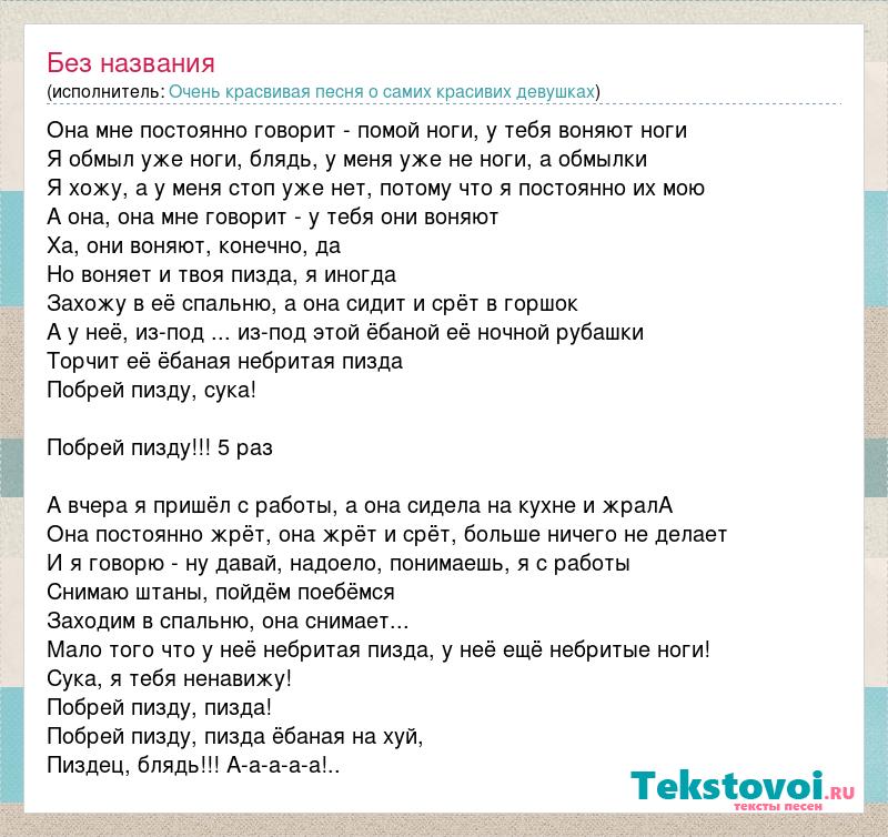 Она мне постоянно говорит - помой ноги, у тебя воняют ноги Я обмыл уже ноги, блядь, у меня уже не ноги, а обмылки Я хожу, а у меня стоп уже нет, потому что я постоянно их мою А она, она мне говорит - у тебя они воняют Ха, они воняют, конечно, да Но воняет и твоя пизда, я иногда Захожу в её спальню, а она сидит и срёт в горшок А у неё, из-под ... из-под этой ёбаной её ночной рубашки Торчит её ёбаная небритая пизда Побрей пизду, сука! Побрей пизду!!! 5 раз А вчера я пришёл с работы, а она сидела на кухне и жралА Она постоянно жрёт, она жрёт и срёт, больше ничего не делает И я говорю - ну давай, надоело, понимаешь, я с работы Снимаю штаны, пойдём поебёмся Заходим в спальню, она снимает... Мало того что у неё небритая пизда, у неё ещё небритые ноги! Сука, я тебя ненавижу! Побрей пизду, пизда! Побрей пизду, пизда ёбаная на хуй, Пиздец, блядь!!! А-а-а-а-а!..