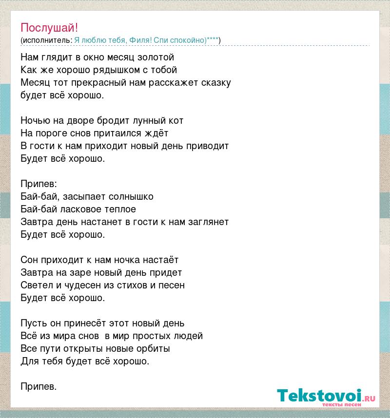 Нам глядит в окно месяц золотой Как же хорошо рядышком с тобой Месяц тот прекрасный нам расскажет сказку будет всё хорошо. Ночью на дворе бродит лунный кот На пороге снов притаился ждёт В гости к нам приходит новый день приводит Будет всё хорошо. Припев: Бай-бай, засыпает солнышко Бай-бай ласковое теплое Завтра день настанет в гости к нам заглянет Будет всё хорошо. Сон приходит к нам ночка настаёт Завтра на заре новый день придет Светел и чудесен из стихов и песен Будет всё хорошо. Пусть он принесёт этот новый день Всё из мира снов в мир простых людей Все пути открыты новые орбиты Для тебя будет всё хорошо. Припев.