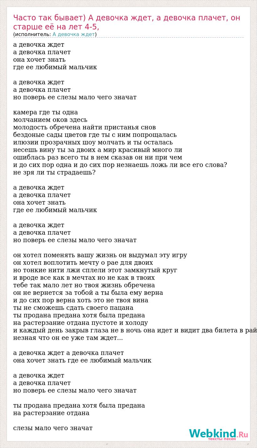 Главная→Исполнители→А девочка ждет→Часто так бывает) А девочка ждет, а девочка плачет, он старше её на лет 4-5,