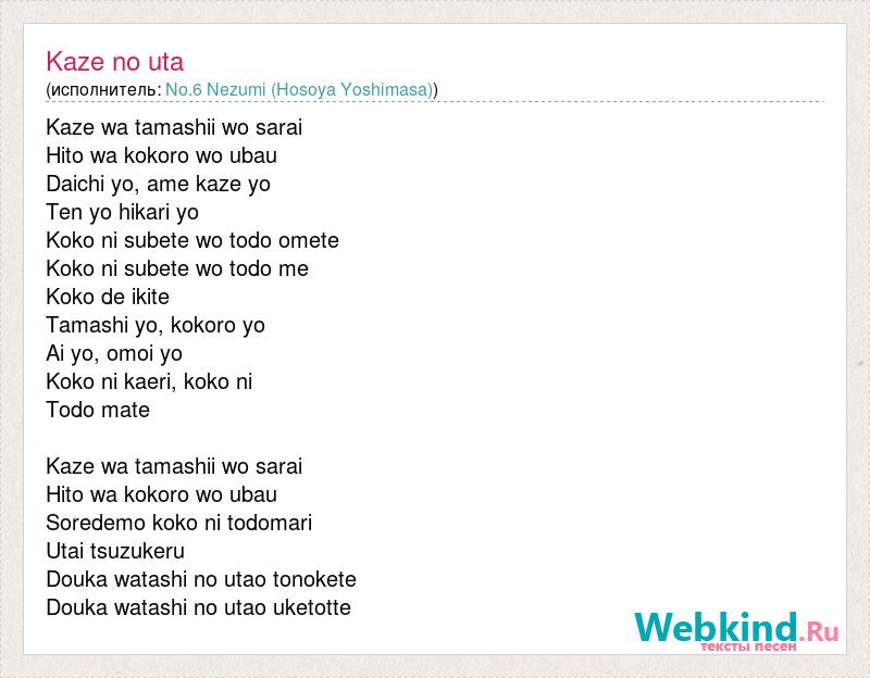 Kaze wa tamashii wo sarai Hito wa kokoro wo ubau Daichi yo, ame kaze yo Ten yo hikari yo Koko ni subete wo todo omete Koko ni subete wo todo me Koko de ikite Tamashi yo, kokoro yo Ai yo, omoi yo Koko ni kaeri, koko ni Todo mate Kaze wa tamashii wo sarai Hito wa kokoro wo ubau Soredemo koko ni todomari Utai tsuzukeru Douka watashi no utao tonokete Douka watashi no utao uketotte