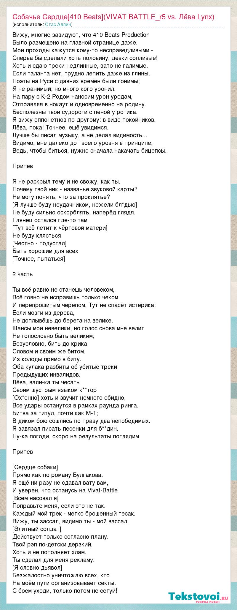 Вижу, многие завидуют, что 410 Beats Production Было размещено на главной странице даже. Мои проходы кажутся кому-то несправедливыми - Сперва бы сделали хоть половину, девки сопливые! Хоть и сдаю треки недлинные, зато не галимые. Если таланта нет, трудно лепить даже из глины. Поэты на Руси с давних времён были гонимы; Я не ранимый; но много кого уронил. На пару с К-2 Родом наносим урон уродам, Отправляя в нокаут и одновременно на родину. Бесполезны твои судороги с пеной у ротика. Я вижу оппонетнов по-другому: в виде покойников. Лёва, пока! Точнее, ещё увидимся. Лучше бы писал музыку, а не делал видимость... Видимо, мне далеко до твоего уровня в принципе, Ведь, чтобы биться, нужно сначала накачать бицепсы. Припев Я не раскрыл тему и не свожу, как ты. Почему твой ник - названье звуковой карты? Не могу понять, что за проклятье? [Я лучше буду неудачником, нежели бл*дью] Не буду сильно оскорблять, наперёд глядя. Глянец остался где-то там [Тут всё летит к чёртовой матери] Не буду клясться [Честно - подустал] Быть хорошим для всех [Точнее, пытаться] 2 часть Ты всё равно не станешь человеком, Всё говно не исправишь только чеком И перепрошитым черепом. Тут не спасёт истерика: Если мозги из дерева, Не доплывёшь до берега на велике. Шансы мои невелики, но голос снова мне велит Не голословно быть великим; Безусловно, бить до крика Словом и своим же битом. Из колоды прямо в биту. Оба кулака разбиты об убитые треки Предыдущих инвалидов. Лёва, вали-ка ты чесать Своим шустрым языком к**тор [Ох*енно] хоть и звучит немного обидно, Все удары останутся в рамках раунда ринга. Битва за титул, почти как М-1; В диком бою сошлись по праву два непобедимых. Я завязал писать песенки для б**дин. Ну-ка погоди, скоро на результаты поглядим Припев [Сердце собаки] Прямо как по роману Булгакова. Я ещё ни разу не сдавал вату вам, И уверен, что останусь на Vivat-Battle [Всем насовал я] Поправьте меня, если это не так. Каждый мой трек - метко брошенный тесак. Вижу, ты зассал, видимо ты - мой вассал. [Элитный солдат] Действует только согласно плану. Твой рэп по-детски дерзкий, Хоть и не пополняет хлам. Ты сделал для меня рекламу. [Я словно дьявол] Безжалостно уничтожаю всех, кто На моём пути организовывает секты. С боем уходи, только потом не сетуй!