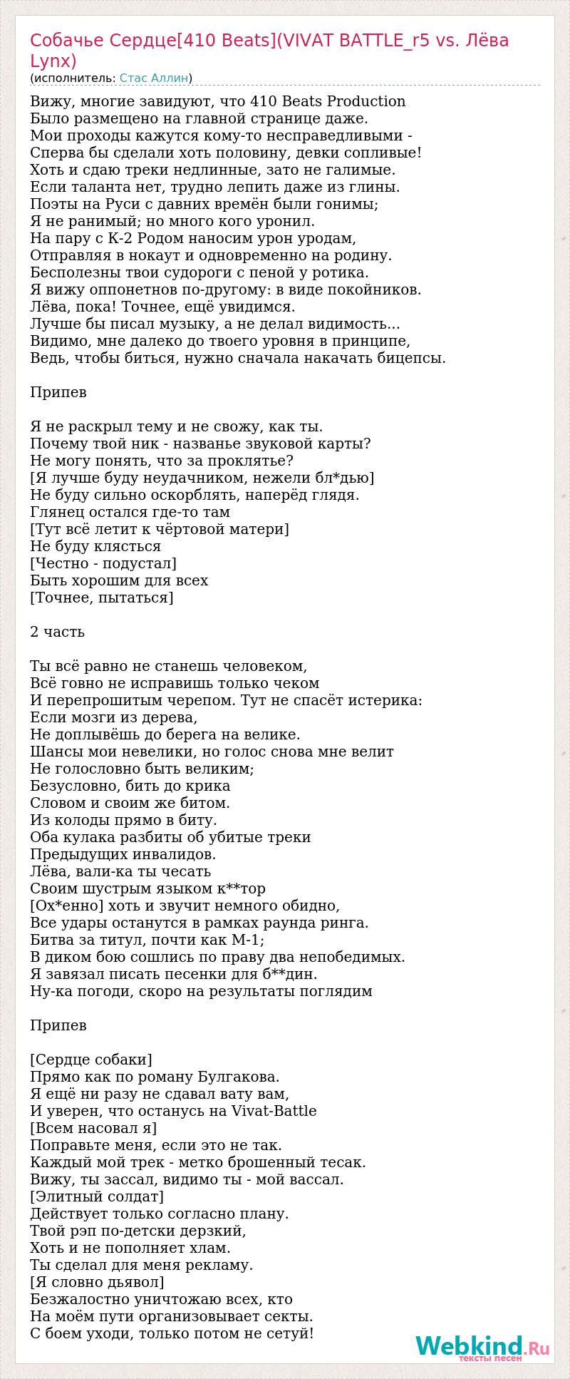 Вижу, многие завидуют, что 410 Beats Production Было размещено на главной странице даже. Мои проходы кажутся кому-то несправедливыми - Сперва бы сделали хоть половину, девки сопливые! Хоть и сдаю треки недлинные, зато не галимые. Если таланта нет, трудно лепить даже из глины. Поэты на Руси с давних времён были гонимы; Я не ранимый; но много кого уронил. На пару с К-2 Родом наносим урон уродам, Отправляя в нокаут и одновременно на родину. Бесполезны твои судороги с пеной у ротика. Я вижу оппонетнов по-другому: в виде покойников. Лёва, пока! Точнее, ещё увидимся. Лучше бы писал музыку, а не делал видимость... Видимо, мне далеко до твоего уровня в принципе, Ведь, чтобы биться, нужно сначала накачать бицепсы. Припев Я не раскрыл тему и не свожу, как ты. Почему твой ник - названье звуковой карты? Не могу понять, что за проклятье? [Я лучше буду неудачником, нежели бл*дью] Не буду сильно оскорблять, наперёд глядя. Глянец остался где-то там [Тут всё летит к чёртовой матери] Не буду клясться [Честно - подустал] Быть хорошим для всех [Точнее, пытаться] 2 часть Ты всё равно не станешь человеком, Всё говно не исправишь только чеком И перепрошитым черепом. Тут не спасёт истерика: Если мозги из дерева, Не доплывёшь до берега на велике. Шансы мои невелики, но голос снова мне велит Не голословно быть великим; Безусловно, бить до крика Словом и своим же битом. Из колоды прямо в биту. Оба кулака разбиты об убитые треки Предыдущих инвалидов. Лёва, вали-ка ты чесать Своим шустрым языком к**тор [Ох*енно] хоть и звучит немного обидно, Все удары останутся в рамках раунда ринга. Битва за титул, почти как М-1; В диком бою сошлись по праву два непобедимых. Я завязал писать песенки для б**дин. Ну-ка погоди, скоро на результаты поглядим Припев [Сердце собаки] Прямо как по роману Булгакова. Я ещё ни разу не сдавал вату вам, И уверен, что останусь на Vivat-Battle [Всем насовал я] Поправьте меня, если это не так. Каждый мой трек - метко брошенный тесак. Вижу, ты зассал, видимо ты - мой вассал. [Элитный солдат] Действует только согласно плану. Твой рэп по-детски дерзкий, Хоть и не пополняет хлам. Ты сделал для меня рекламу. [Я словно дьявол] Безжалостно уничтожаю всех, кто На моём пути организовывает секты. С боем уходи, только потом не сетуй!