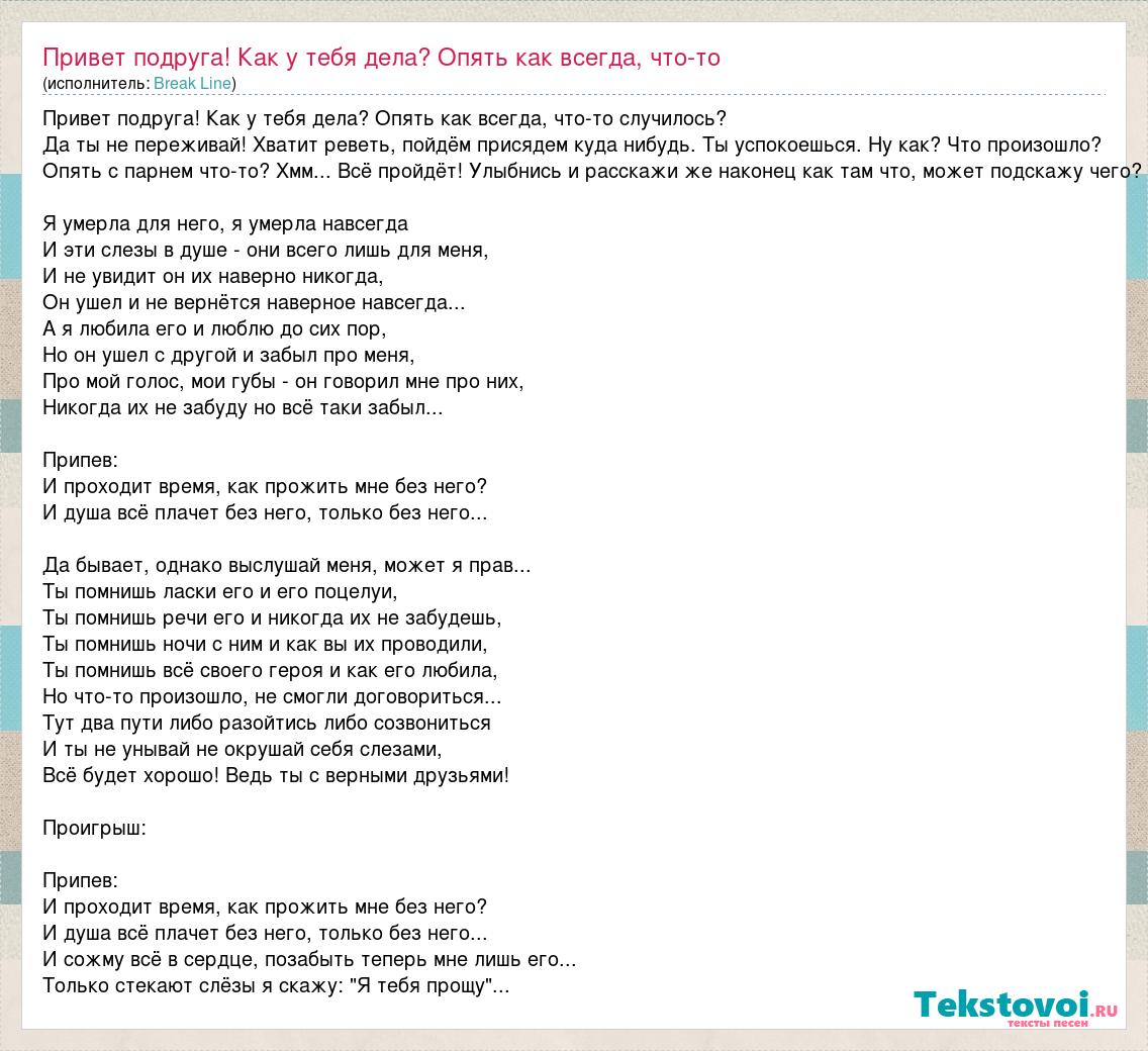 Главная→Исполнители→Break Line→Привет подруга! Как у тебя дела? Опять как всегда, что-то случилось? Да ты