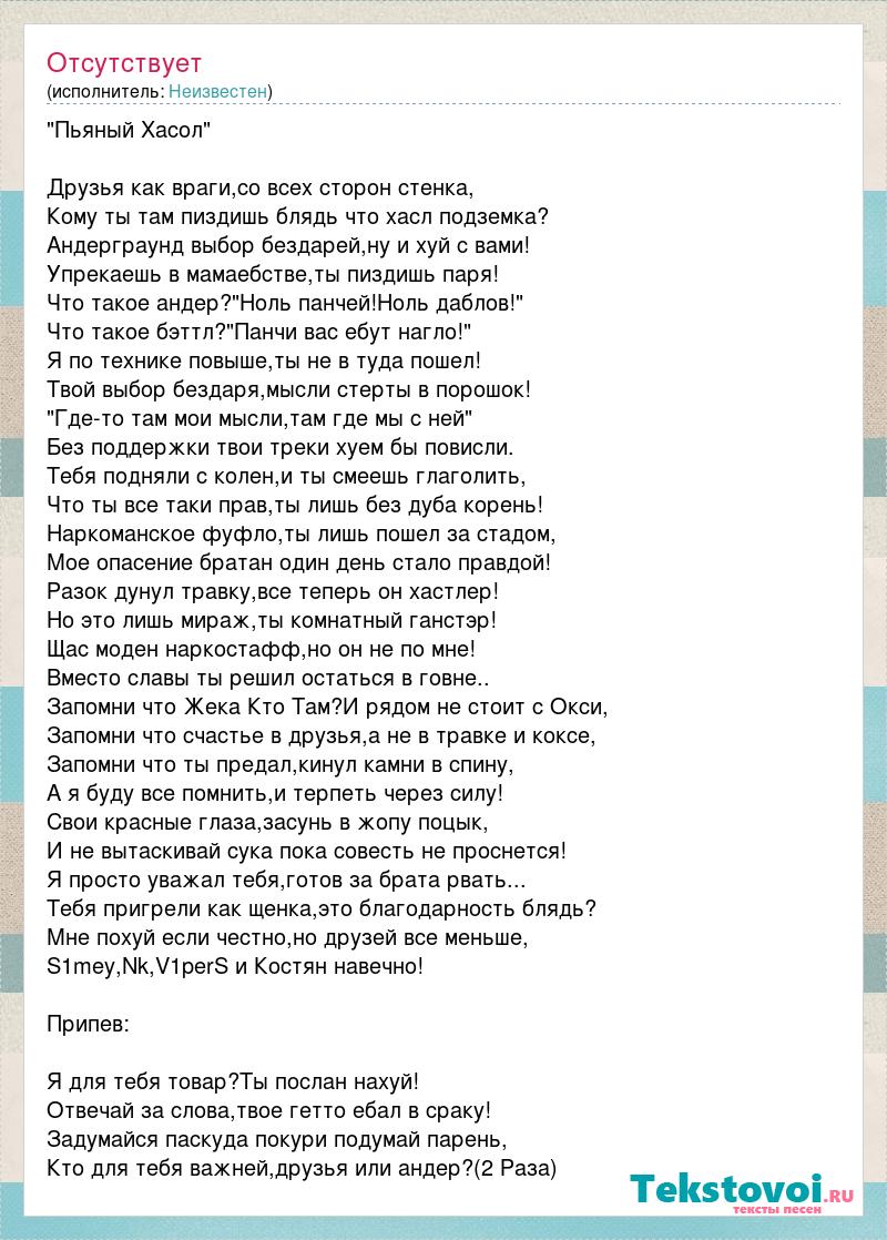 "Пьяный Хасол" Друзья как враги,со всех сторон стенка, Кому ты там пиздишь блядь что хасл подземка? Андерграунд выбор бездарей,ну и хуй с вами! Упрекаешь в мамаебстве,ты пиздишь паря! Что такое андер?"Ноль панчей!Ноль даблов!" Что такое бэттл?"Панчи вас ебут нагло!" Я по технике повыше,ты не в туда пошел! Твой выбор бездаря,мысли стерты в порошок! "Где-то там мои мысли,там где мы с ней" Без поддержки твои треки хуем бы повисли. Тебя подняли с колен,и ты смеешь глаголить, Что ты все таки прав,ты лишь без дуба корень! Наркоманское фуфло,ты лишь пошел за стадом, Мое опасение братан один день стало правдой! Разок дунул травку,все теперь он хастлер! Но это лишь мираж,ты комнатный ганстэр! Щас моден наркостафф,но он не по мне! Вместо славы ты решил остаться в говне.. Запомни что Жека Кто Там?И рядом не стоит с Окси, Запомни что счастье в друзья,а не в травке и коксе, Запомни что ты предал,кинул камни в спину, А я буду все помнить,и терпеть через силу! Свои красные глаза,засунь в жопу поцык, И не вытаскивай сука пока совесть не проснется! Я просто уважал тебя,готов за брата рвать... Тебя пригрели как щенка,это благодарность блядь? Мне похуй если честно,но друзей все меньше, S1mey,Nk,V1perS и Костян навечно! Припев: Я для тебя товар?Ты послан нахуй! Отвечай за слова,твое гетто ебал в сраку! Задумайся паскуда покури подумай парень, Кто для тебя важней,друзья или андер?(2 Раза)