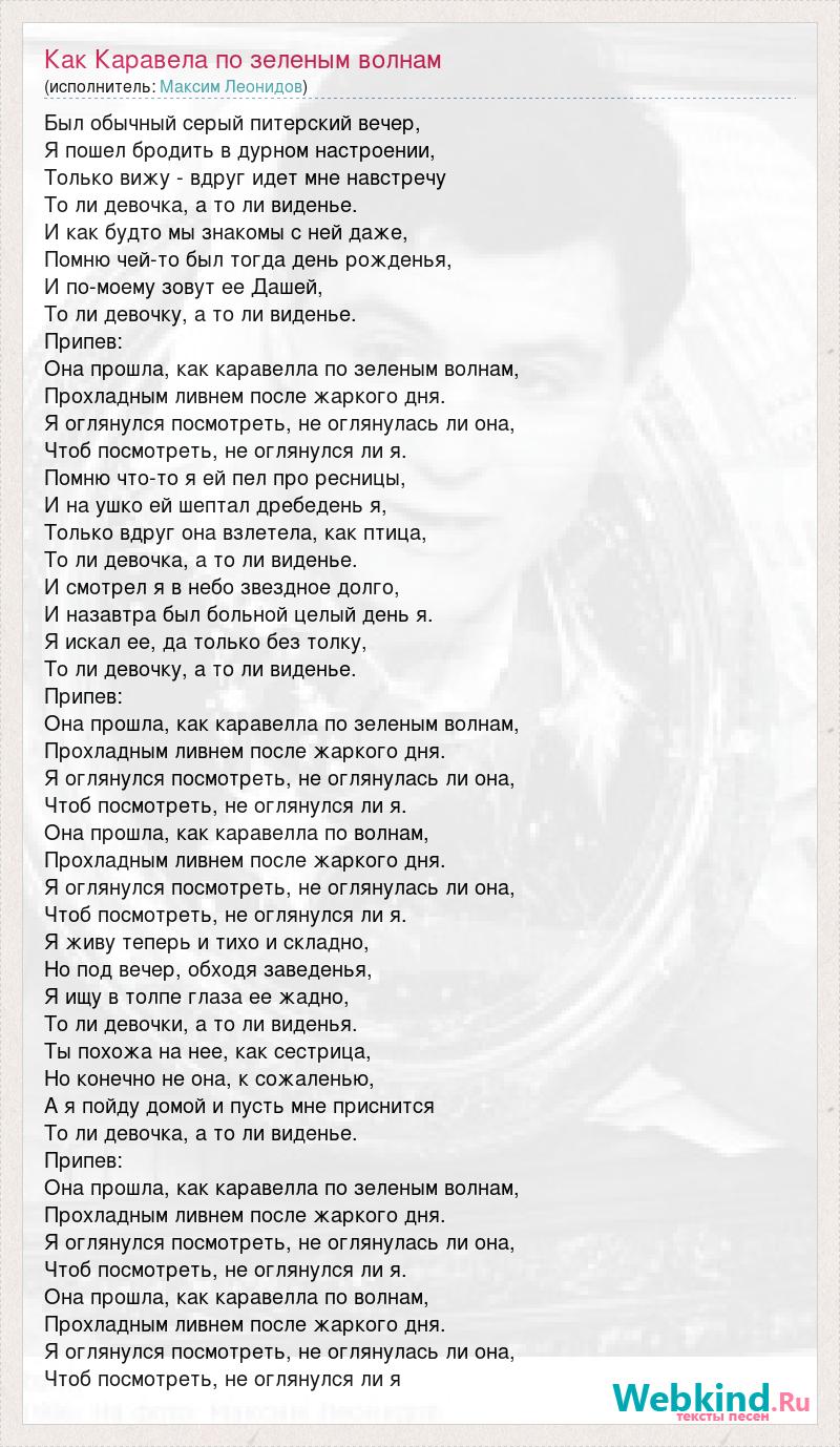 Был обычный серый питерский вечер, Я пошел бродить в дурном настроении, Только вижу - вдруг идет мне навстречу То ли девочка, а то ли виденье. И как будто мы знакомы с ней даже, Помню чей-то был тогда день рожденья, И по-моему зовут ее Дашей, То ли девочку, а то ли виденье. Припев: Она прошла, как каравелла по зеленым волнам, Прохладным ливнем после жаркого дня. Я оглянулся посмотреть, не оглянулась ли она, Чтоб посмотреть, не оглянулся ли я. Помню что-то я ей пел про ресницы, И на ушко ей шептал дребедень я, Только вдруг она взлетела, как птица, То ли девочка, а то ли виденье. И смотрел я в небо звездное долго, И назавтра был больной целый день я. Я искал ее, да только без толку, То ли девочку, а то ли виденье. Припев: Она прошла, как каравелла по зеленым волнам, Прохладным ливнем после жаркого дня. Я оглянулся посмотреть, не оглянулась ли она, Чтоб посмотреть, не оглянулся ли я. Она прошла, как каравелла по волнам, Прохладным ливнем после жаркого дня. Я оглянулся посмотреть, не оглянулась ли она, Чтоб посмотреть, не оглянулся ли я. Я живу теперь и тихо и складно, Но под вечер, обходя заведенья, Я ищу в толпе глаза ее жадно, То ли девочки, а то ли виденья. Ты похожа на нее, как сестрица, Но конечно не она, к сожаленью, А я пойду домой и пусть мне приснится То ли девочка, а то ли виденье. Припев: Она прошла, как каравелла по зеленым волнам, Прохладным ливнем после жаркого дня. Я оглянулся посмотреть, не оглянулась ли она, Чтоб посмотреть, не оглянулся ли я. Она прошла, как каравелла по волнам, Прохладным ливнем после жаркого дня. Я оглянулся посмотреть, не оглянулась ли она, Чтоб посмотреть, не оглянулся ли я