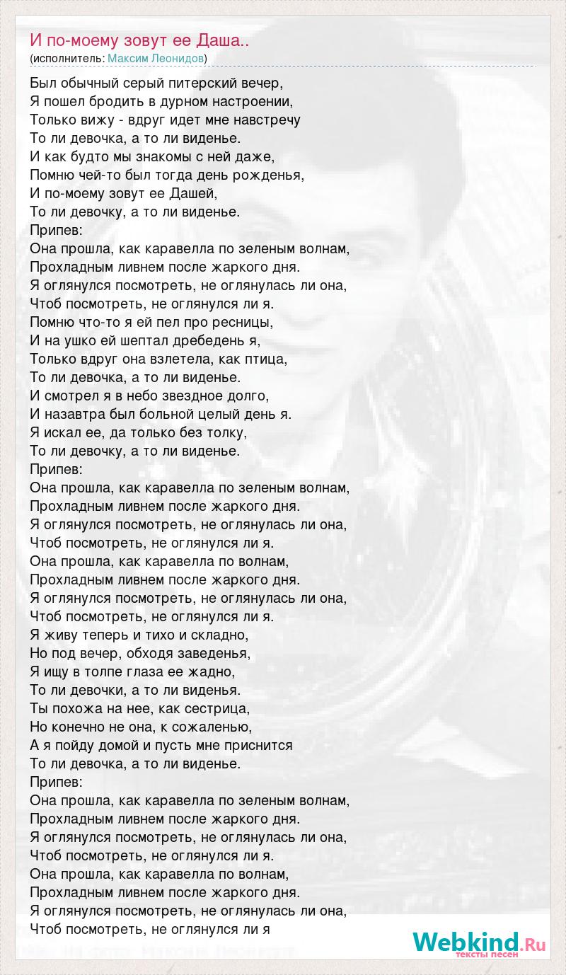 Был обычный серый питерский вечер, Я пошел бродить в дурном настроении, Только вижу - вдруг идет мне навстречу То ли девочка, а то ли виденье. И как будто мы знакомы с ней даже, Помню чей-то был тогда день рожденья, И по-моему зовут ее Дашей, То ли девочку, а то ли виденье. Припев: Она прошла, как каравелла по зеленым волнам, Прохладным ливнем после жаркого дня. Я оглянулся посмотреть, не оглянулась ли она, Чтоб посмотреть, не оглянулся ли я. Помню что-то я ей пел про ресницы, И на ушко ей шептал дребедень я, Только вдруг она взлетела, как птица, То ли девочка, а то ли виденье. И смотрел я в небо звездное долго, И назавтра был больной целый день я. Я искал ее, да только без толку, То ли девочку, а то ли виденье. Припев: Она прошла, как каравелла по зеленым волнам, Прохладным ливнем после жаркого дня. Я оглянулся посмотреть, не оглянулась ли она, Чтоб посмотреть, не оглянулся ли я. Она прошла, как каравелла по волнам, Прохладным ливнем после жаркого дня. Я оглянулся посмотреть, не оглянулась ли она, Чтоб посмотреть, не оглянулся ли я. Я живу теперь и тихо и складно, Но под вечер, обходя заведенья, Я ищу в толпе глаза ее жадно, То ли девочки, а то ли виденья. Ты похожа на нее, как сестрица, Но конечно не она, к сожаленью, А я пойду домой и пусть мне приснится То ли девочка, а то ли виденье. Припев: Она прошла, как каравелла по зеленым волнам, Прохладным ливнем после жаркого дня. Я оглянулся посмотреть, не оглянулась ли она, Чтоб посмотреть, не оглянулся ли я. Она прошла, как каравелла по волнам, Прохладным ливнем после жаркого дня. Я оглянулся посмотреть, не оглянулась ли она, Чтоб посмотреть, не оглянулся ли я