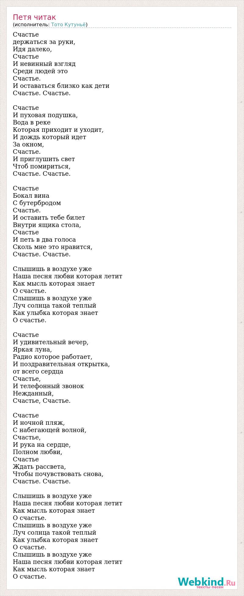 Счастье держаться за руки, Идя далеко, Счастье И невинный взгляд Среди людей это Счастье. И оставаться близко как дети Счастье. Счастье. Счастье И пуховая подушка, Вода в реке Которая приходит и уходит, И дождь который идет За окном, Счастье. И приглушить свет Чтоб помириться, Счастье. Счастье. Счастье Бокал вина С бутербродом Счастье. И оставить тебе билет Внутри ящика стола, Счастье И петь в два голоса Сколь мне это нравится, Счастье. Счастье. Слышишь в воздухе уже Наша песня любви которая летит Как мысль которая знает О счастье. Слышишь в воздухе уже Луч солнца такой теплый Как улыбка которая знает О счастье. Счастье И удивительный вечер, Яркая луна, Радио которое работает, И поздравительная открытка, от всего сердца Счастье, И телефонный звонок Нежданный, Счастье, Счастье. Счастье И ночной пляж, С набегающей волной, Счастье, И рука на сердце, Полном любви, Счастье Ждать рассвета, Чтобы почувствовать снова, Счастье. Счастье. Слышишь в воздухе уже Наша песня любви которая летит Как мысль которая знает О счастье. Слышишь в воздухе уже Луч солнца такой теплый Как улыбка которая знает О счастье. Слышишь в воздухе уже Наша песня любви которая летит Как мысль которая знает О счастье.