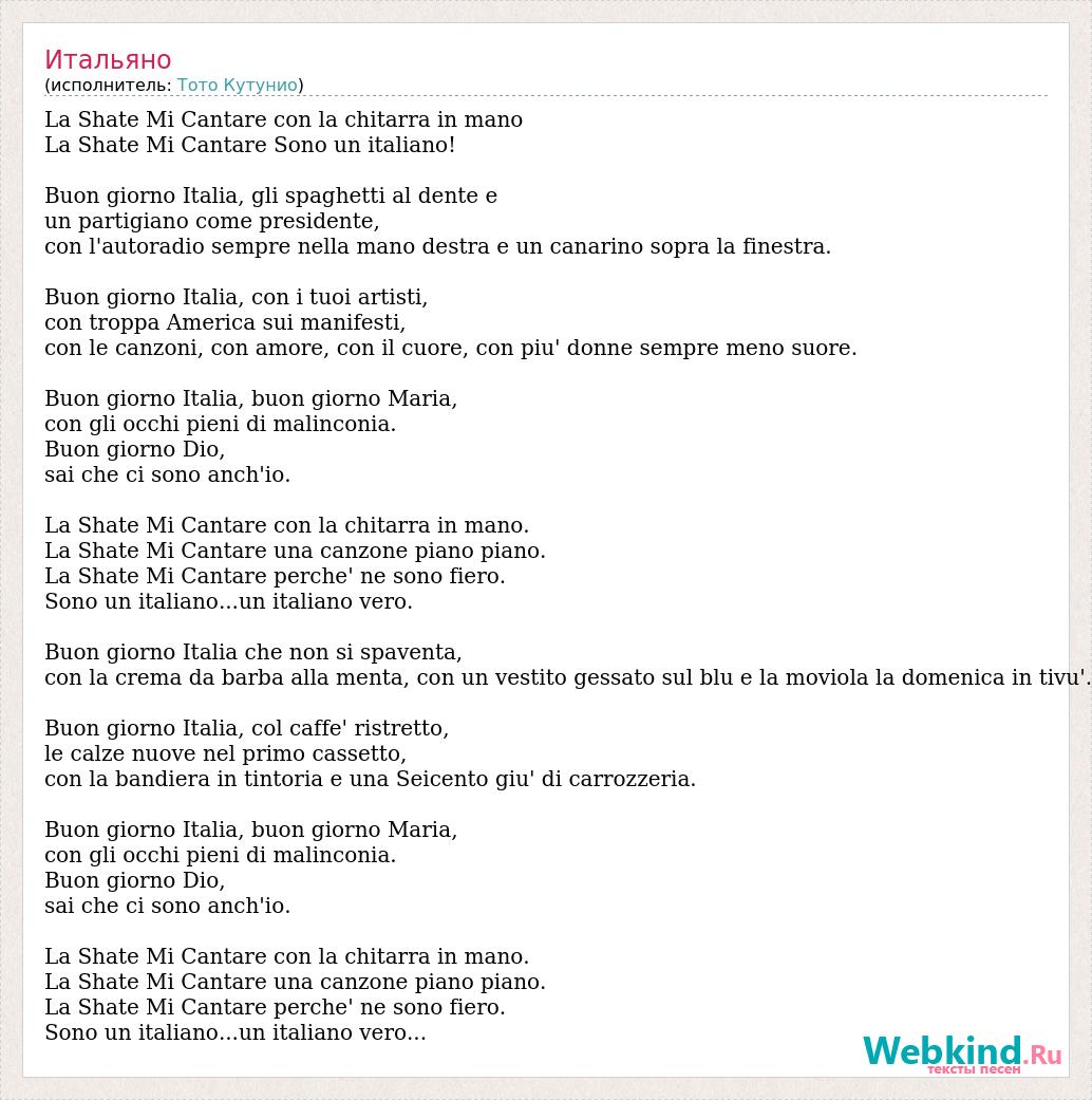 La Shate Mi Cantare con la chitarra in mano La Shate Mi Cantare Sono un italiano! Buon giorno Italia, gli spaghetti al dente e un partigiano come presidente, con l'autoradio sempre nella mano destra e un canarino sopra la finestra. Buon giorno Italia, con i tuoi artisti, con troppa America sui manifesti, con le canzoni, con amore, con il cuore, con piu' donne sempre meno suore. Buon giorno Italia, buon giorno Maria, con gli occhi pieni di malinconia. Buon giorno Dio, sai che ci sono anch'io. La Shate Mi Cantare con la chitarra in mano. La Shate Mi Cantare una canzone piano piano. La Shate Mi Cantare perche' ne sono fiero. Sono un italiano...un italiano vero. Buon giorno Italia che non si spaventa, con la crema da barba alla menta, con un vestito gessato sul blu e la moviola la domenica in tivu'. Buon giorno Italia, col caffe' ristretto, le calze nuove nel primo cassetto, con la bandiera in tintoria e una Seicento giu' di carrozzeria. Buon giorno Italia, buon giorno Maria, con gli occhi pieni di malinconia. Buon giorno Dio, sai che ci sono anch'io. La Shate Mi Cantare con la chitarra in mano. La Shate Mi Cantare una canzone piano piano. La Shate Mi Cantare perche' ne sono fiero. Sono un italiano...un italiano vero...