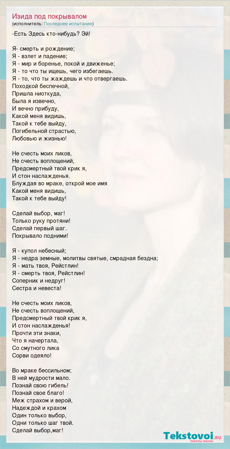 -Есть Здесь кто-нибудь? Эй! Я- смерть и рождение; Я - взлет и падение; Я - мир и боренье, покой и движенье; Я - то что ты ищешь, чего избегаешь. Я - то, что ты жаждешь и что отвергаешь. Походкой беспечной, Пришла ниоткуда, Была я извечно, И вечно прибуду, Какой меня видишь, Такой к тебе выйду, Погибельной страстью, Любовью и жизнью! Не счесть моих ликов, Не счесть воплощений, Предсмертный твой крик я, И стон наслажденья. Блуждая во мраке, открой мое имя Какой меня видишь, Такой к тебе выйду! Сделай выбор, маг! Только руку протяни! Сделай первый шаг. Покрывало подними! Я - купол небесный; Я - недра земные, молитвы святые, смрадная бездна; Я - мать твоя, Рейстлин! Я - смерть твоя, Рейстлин! Соперник и недруг! Сестра и невеста! Не счесть моих ликов, Не счесть воплощений, Предсмертный твой крик я, И стон наслажденья! Прочти эти знаки, Что я начертала, Со смутного лика Сорви одеяло! Во мраке бессильном; В ней мудрости мало. Познай свою гибель! Познай свое благо! Меж страхом и верой, Надеждой и крахом Один только выбор, Одни только шаг твой. Сделай выбор,маг!
