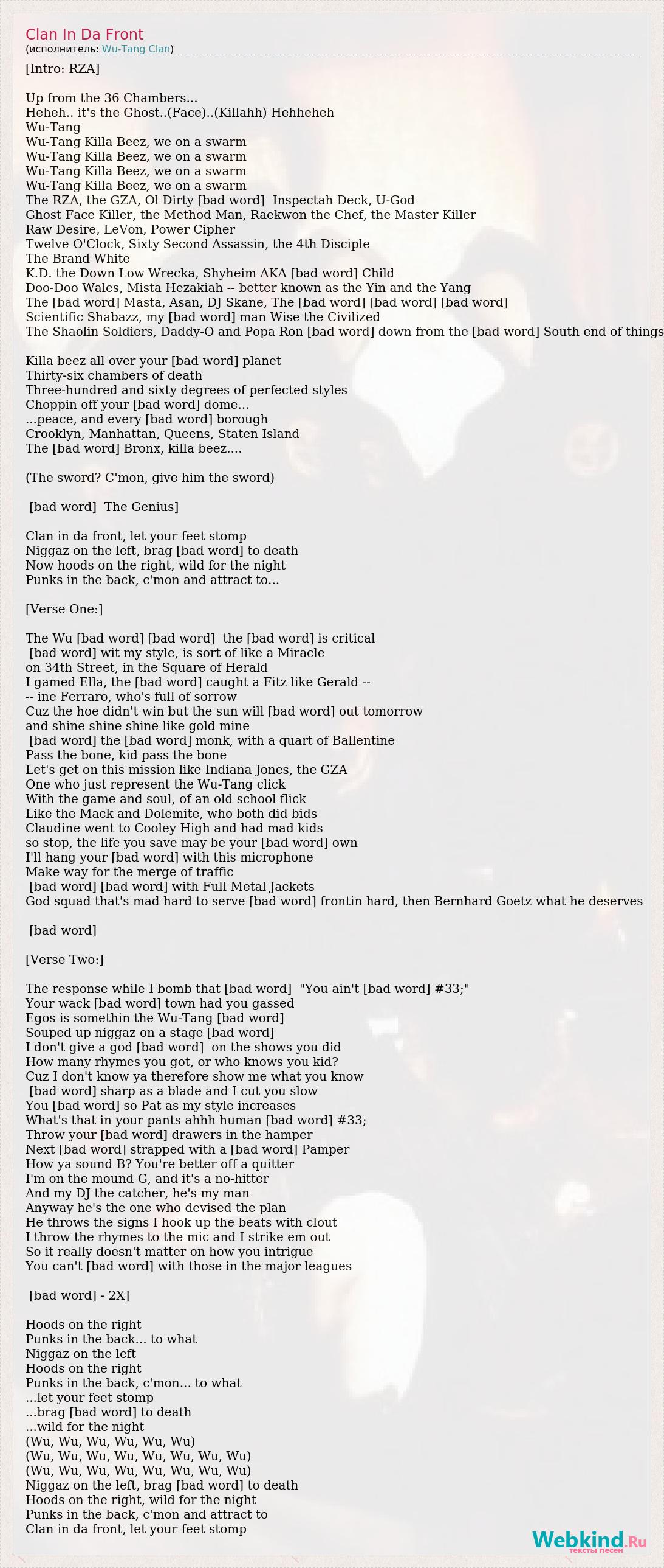 [Intro: RZA] Up from the 36 Chambers... Heheh.. it's the Ghost..(Face)..(Killahh) Hehheheh Wu-Tang Wu-Tang Killa Beez, we on a swarm Wu-Tang Killa Beez, we on a swarm Wu-Tang Killa Beez, we on a swarm Wu-Tang Killa Beez, we on a swarm The RZA, the GZA, Ol Dirty [bad word] Inspectah Deck, U-God Ghost Face Killer, the Method Man, Raekwon the Chef, the Master Killer Raw Desire, LeVon, Power Cipher Twelve O'Clock, Sixty Second Assassin, the 4th Disciple The Brand White K.D. the Down Low Wrecka, Shyheim AKA [bad word] Child Doo-Doo Wales, Mista Hezakiah -- better known as the Yin and the Yang The [bad word] Masta, Asan, DJ Skane, The [bad word] [bad word] [bad word] Scientific Shabazz, my [bad word] man Wise the Civilized The Shaolin Soldiers, Daddy-O and Popa Ron [bad word] down from the [bad word] South end of things Killa beez all over your [bad word] planet Thirty-six chambers of death Three-hundred and sixty degrees of perfected styles Choppin off your [bad word] dome... ...peace, and every [bad word] borough Crooklyn, Manhattan, Queens, Staten Island The [bad word] Bronx, killa beez.... (The sword? C'mon, give him the sword) [bad word] The Genius] Clan in da front, let your feet stomp Niggaz on the left, brag [bad word] to death Now hoods on the right, wild for the night Punks in the back, c'mon and attract to... [Verse One:] The Wu [bad word] [bad word] the [bad word] is critical [bad word] wit my style, is sort of like a Miracle on 34th Street, in the Square of Herald I gamed Ella, the [bad word] caught a Fitz like Gerald -- -- ine Ferraro, who's full of sorrow Cuz the hoe didn't win but the sun will [bad word] out tomorrow and shine shine shine like gold mine [bad word] the [bad word] monk, with a quart of Ballentine Pass the bone, kid pass the bone Let's get on this mission like Indiana Jones, the GZA One who just represent the Wu-Tang click With the game and soul, of an old school flick Like the Mack and Dolemite, who both did bids Claudine went to Cooley High and had mad kids so stop, the life you save may be your [bad word] own I'll hang your [bad word] with this microphone Make way for the merge of traffic [bad word] [bad word] with Full Metal Jackets God squad that's mad hard to serve [bad word] frontin hard, then Bernhard Goetz what he deserves [bad word] [Verse Two:] The response while I bomb that [bad word] "You ain't [bad word] #33;" Your wack [bad word] town had you gassed Egos is somethin the Wu-Tang [bad word] Souped up niggaz on a stage [bad word] I don't give a god [bad word] on the shows you did How many rhymes you got, or who knows you kid? Cuz I don't know ya therefore show me what you know [bad word] sharp as a blade and I cut you slow You [bad word] so Pat as my style increases What's that in your pants ahhh human [bad word] #33; Throw your [bad word] drawers in the hamper Next [bad word] strapped with a [bad word] Pamper How ya sound B? You're better off a quitter I'm on the mound G, and it's a no-hitter And my DJ the catcher, he's my man Anyway he's the one who devised the plan He throws the signs I hook up the beats with clout I throw the rhymes to the mic and I strike em out So it really doesn't matter on how you intrigue You can't [bad word] with those in the major leagues [bad word] - 2X] Hoods on the right Punks in the back... to what Niggaz on the left Hoods on the right Punks in the back, c'mon... to what ...let your feet stomp ...brag [bad word] to death ...wild for the night (Wu, Wu, Wu, Wu, Wu, Wu) (Wu, Wu, Wu, Wu, Wu, Wu, Wu, Wu) (Wu, Wu, Wu, Wu, Wu, Wu, Wu, Wu) Niggaz on the left, brag [bad word] to death Hoods on the right, wild for the night Punks in the back, c'mon and attract to Clan in da front, let your feet stomp