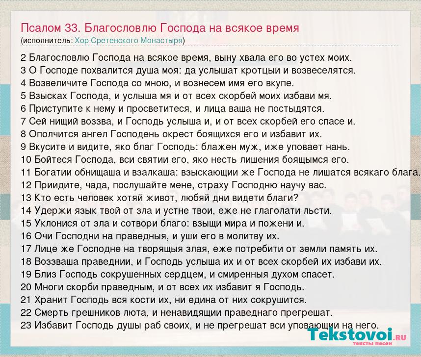 2 Благословлю Господа на всякое время, выну хвала его во устех моих. 3 О Господе похвалится душа моя: да услышат кротцыи и возвеселятся. 4 Возвеличите Господа со мною, и вознесем имя его вкупе. 5 Взысках Господа, и услыша мя и от всех скорбей моих избави мя. 6 Приступите к нему и просветитеся, и лица ваша не постыдятся. 7 Сей нищий воззва, и Господь услыша и, и от всех скорбей его спасе и. 8 Ополчится ангел Господень окрест боящихся его и избавит их. 9 Вкусите и видите, яко благ Господь: блажен муж, иже уповает нань. 10 Бойтеся Господа, вси святии его, яко несть лишения боящымся его. 11 Богатии обнищаша и взалкаша: взыскающии же Господа не лишатся всякаго блага. 12 Приидите, чада, послушайте мене, страху Господню научу вас. 13 Кто есть человек хотяй живот, любяй дни видети благи? 14 Удержи язык твой от зла и устне твои, еже не глаголати льсти. 15 Уклонися от зла и сотвори благо: взыщи мира и пожени и. 16 Очи Господни на праведныя, и уши его в молитву их. 17 Лице же Господне на творящыя злая, еже потребити от земли память их. 18 Воззваша праведнии, и Господь услыша их и от всех скорбей их избави их. 19 Близ Господь сокрушенных сердцем, и смиренныя духом спасет. 20 Многи скорби праведным, и от всех их избавит я Господь. 21 Хранит Господь вся кости их, ни едина от них сокрушится. 22 Смерть грешников люта, и ненавидящии праведнаго прегрешат. 23 Избавит Господь душы раб своих, и не прегрешат вси уповающии на него.