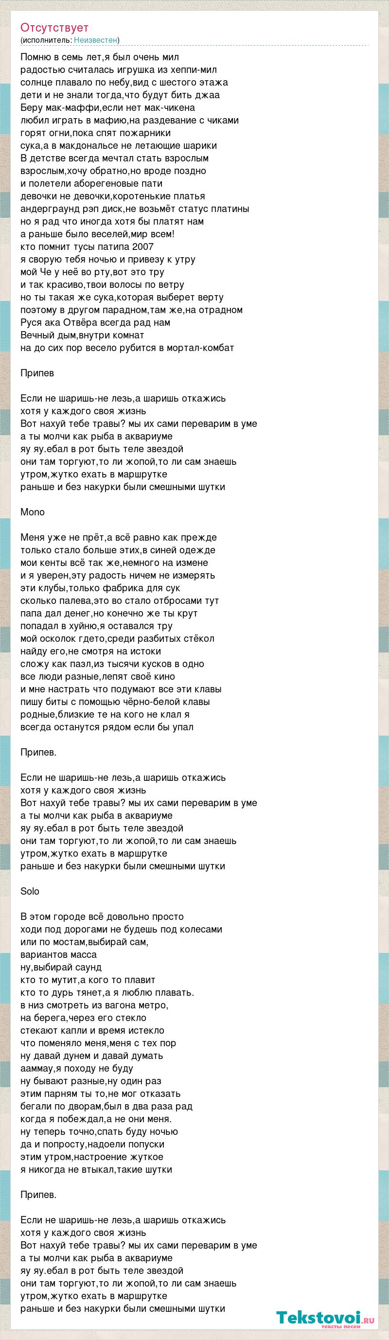 Помню в семь лет,я был очень мил радостью считалась игрушка из хеппи-мил солнце плавало по небу,вид с шестого этажа дети и не знали тогда,что будут бить джаа Беру мак-маффи,если нет мак-чикена любил играть в мафию,на раздевание с чиками горят огни,пока спят пожарники сука,а в макдональсе не летающие шарики В детстве всегда мечтал стать взрослым взрослым,хочу обратно,но вроде поздно и полетели аборегеновые пати девочки не девочки,коротенькие платья андерграунд рэп диск,не возьмёт статус платины но я рад что иногда хотя бы платят нам а раньше было веселей,мир всем! кто помнит тусы патипа 2007 я сворую тебя ночью и привезу к утру мой Че у неё во рту,вот это тру и так красиво,твои волосы по ветру но ты такая же сука,которая выберет верту поэтому в другом парадном,там же,на отрадном Руся ака Отвёра всегда рад нам Вечный дым,внутри комнат на до сих пор весело рубится в мортал-комбат Припев Если не шаришь-не лезь,а шаришь откажись хотя у каждого своя жизнь Вот нахуй тебе травы? мы их сами переварим в уме а ты молчи как рыба в аквариуме яу яу.ебал в рот быть теле звездой они там торгуют,то ли жопой,то ли сам знаешь утром,жутко ехать в маршрутке раньше и без накурки были смешными шутки Mono Меня уже не прёт,а всё равно как прежде только стало больше этих,в синей одежде мои кенты всё так же,немного на измене и я уверен,эту радость ничем не измерять эти клубы,только фабрика для сук сколько палева,это во стало отбросами тут папа дал денег,но конечно же ты крут попадал в хуйню,я оставался тру мой осколок гдето,среди разбитых стёкол найду его,не смотря на истоки сложу как пазл,из тысячи кусков в одно все люди разные,лепят своё кино и мне настрать что подумают все эти клавы пишу биты с помощью чёрно-белой клавы родные,близкие те на кого не клал я всегда останутся рядом если бы упал Припев. Если не шаришь-не лезь,а шаришь откажись хотя у каждого своя жизнь Вот нахуй тебе травы? мы их сами переварим в уме а ты молчи как рыба в аквариуме яу яу.ебал в рот быть теле звездой они там торгуют,то ли жопой,то ли сам знаешь утром,жутко ехать в маршрутке раньше и без накурки были смешными шутки Solo В этом городе всё довольно просто ходи под дорогами не будешь под колесами или по мостам,выбирай сам, вариантов масса ну,выбирай саунд кто то мутит,а кого то плавит кто то дурь тянет,а я люблю плавать. в низ смотреть из вагона метро, на берега,через его стекло стекают капли и время истекло что поменяло меня,меня с тех пор ну давай дунем и давай думать ааммау,я походу не буду ну бывают разные,ну один раз этим парням ты то,не мог отказать бегали по дворам,был в два раза рад когда я побеждал,а не они меня. ну теперь точно,спать буду ночью да и попросту,надоели попуски этим утром,настроение жуткое я никогда не втыкал,такие шутки Припев. Если не шаришь-не лезь,а шаришь откажись хотя у каждого своя жизнь Вот нахуй тебе травы? мы их сами переварим в уме а ты молчи как рыба в аквариуме яу яу.ебал в рот быть теле звездой они там торгуют,то ли жопой,то ли сам знаешь утром,жутко ехать в маршрутке раньше и без накурки были смешными шутки