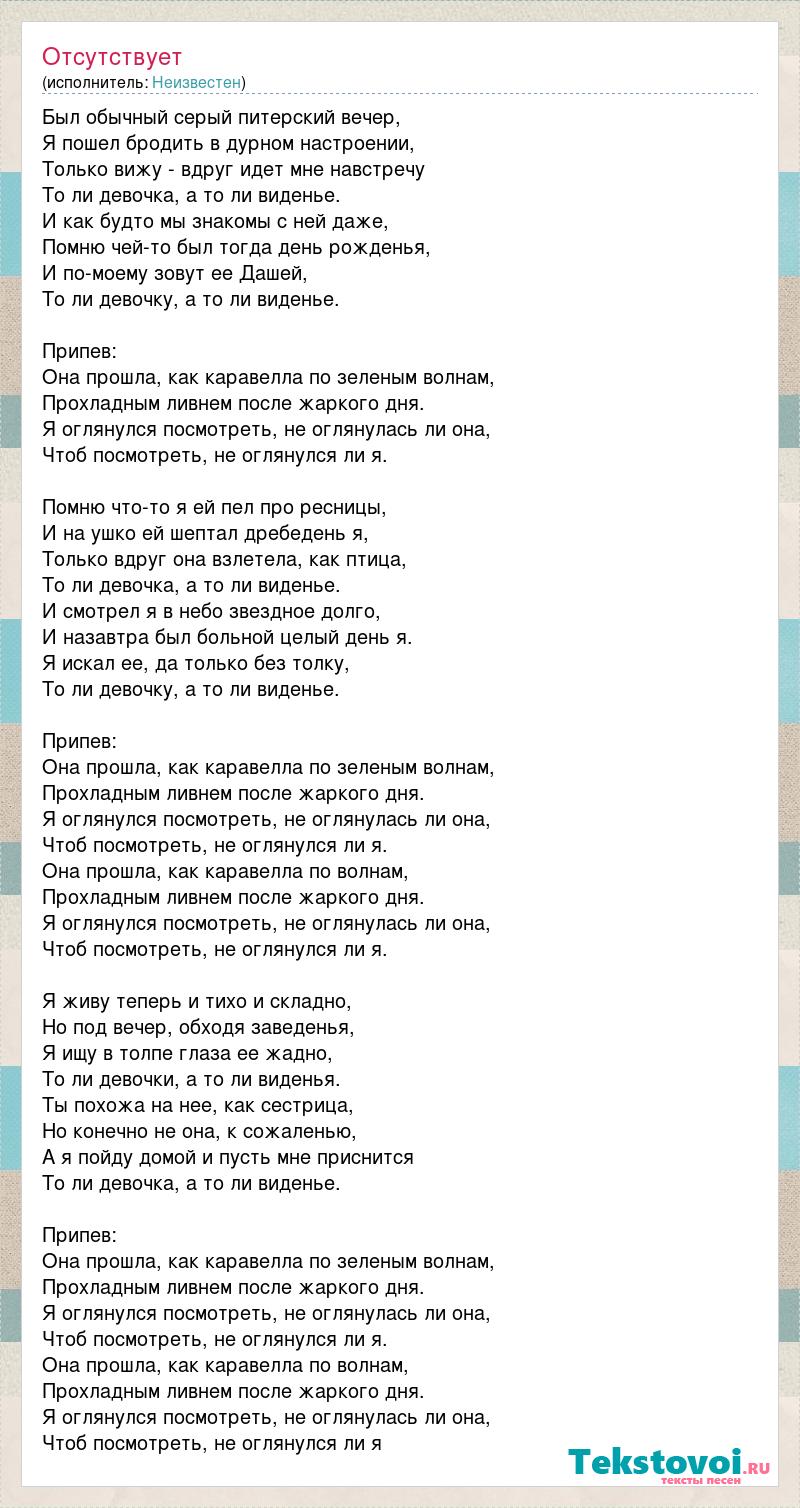 Был обычный серый питерский вечер, Я пошел бродить в дурном настроении, Только вижу - вдруг идет мне навстречу То ли девочка, а то ли виденье. И как будто мы знакомы с ней даже, Помню чей-то был тогда день рожденья, И по-моему зовут ее Дашей, То ли девочку, а то ли виденье. Припев: Она прошла, как каравелла по зеленым волнам, Прохладным ливнем после жаркого дня. Я оглянулся посмотреть, не оглянулась ли она, Чтоб посмотреть, не оглянулся ли я. Помню что-то я ей пел про ресницы, И на ушко ей шептал дребедень я, Только вдруг она взлетела, как птица, То ли девочка, а то ли виденье. И смотрел я в небо звездное долго, И назавтра был больной целый день я. Я искал ее, да только без толку, То ли девочку, а то ли виденье. Припев: Она прошла, как каравелла по зеленым волнам, Прохладным ливнем после жаркого дня. Я оглянулся посмотреть, не оглянулась ли она, Чтоб посмотреть, не оглянулся ли я. Она прошла, как каравелла по волнам, Прохладным ливнем после жаркого дня. Я оглянулся посмотреть, не оглянулась ли она, Чтоб посмотреть, не оглянулся ли я. Я живу теперь и тихо и складно, Но под вечер, обходя заведенья, Я ищу в толпе глаза ее жадно, То ли девочки, а то ли виденья. Ты похожа на нее, как сестрица, Но конечно не она, к сожаленью, А я пойду домой и пусть мне приснится То ли девочка, а то ли виденье. Припев: Она прошла, как каравелла по зеленым волнам, Прохладным ливнем после жаркого дня. Я оглянулся посмотреть, не оглянулась ли она, Чтоб посмотреть, не оглянулся ли я. Она прошла, как каравелла по волнам, Прохладным ливнем после жаркого дня. Я оглянулся посмотреть, не оглянулась ли она, Чтоб посмотреть, не оглянулся ли я