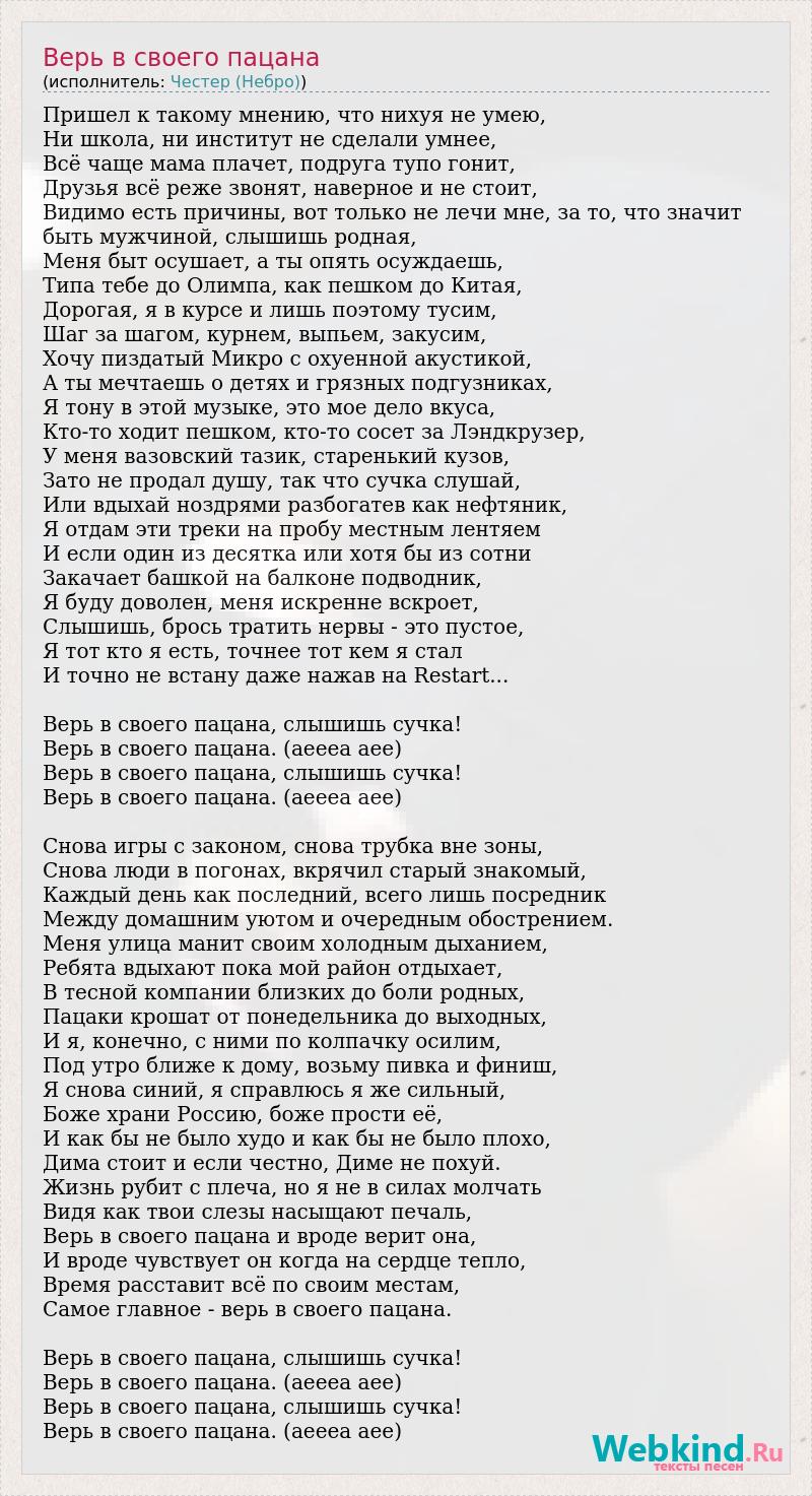 Пришел к такому мнению, что нихуя не умею, Ни школа, ни институт не сделали умнее, Всё чаще мама плачет, подруга тупо гонит, Друзья всё реже звонят, наверное и не стоит, Видимо есть причины, вот только не лечи мне, за то, что значит быть мужчиной, слышишь родная, Меня быт осушает, а ты опять осуждаешь, Типа тебе до Олимпа, как пешком до Китая, Дорогая, я в курсе и лишь поэтому тусим, Шаг за шагом, курнем, выпьем, закусим, Хочу пиздатый Микро с охуенной акустикой, А ты мечтаешь о детях и грязных подгузниках, Я тону в этой музыке, это мое дело вкуса, Кто-то ходит пешком, кто-то сосет за Лэндкрузер, У меня вазовский тазик, старенький кузов, Зато не продал душу, так что сучка слушай, Или вдыхай ноздрями разбогатев как нефтяник, Я отдам эти треки на пробу местным лентяем И если один из десятка или хотя бы из сотни Закачает башкой на балконе подводник, Я буду доволен, меня искренне вскроет, Слышишь, брось тратить нервы - это пустое, Я тот кто я есть, точнее тот кем я стал И точно не встану даже нажав на Restart... Верь в своего пацана, слышишь сучка! Верь в своего пацана. (аеееа аее) Верь в своего пацана, слышишь сучка! Верь в своего пацана. (аеееа аее) Снова игры с законом, снова трубка вне зоны, Снова люди в погонах, вкрячил старый знакомый, Каждый день как последний, всего лишь посредник Между домашним уютом и очередным обострением. Меня улица манит своим холодным дыханием, Ребята вдыхают пока мой район отдыхает, В тесной компании близких до боли родных, Пацаки крошат от понедельника до выходных, И я, конечно, с ними по колпачку осилим, Под утро ближе к дому, возьму пивка и финиш, Я снова синий, я справлюсь я же сильный, Боже храни Россию, боже прости её, И как бы не было худо и как бы не было плохо, Дима стоит и если честно, Диме не похуй. Жизнь рубит с плеча, но я не в силах молчать Видя как твои слезы насыщают печаль, Верь в своего пацана и вроде верит она, И вроде чувствует он когда на сердце тепло, Время расставит всё по своим местам, Самое главное - верь в своего пацана. Верь в своего пацана, слышишь сучка! Верь в своего пацана. (аеееа аее) Верь в своего пацана, слышишь сучка! Верь в своего пацана. (аеееа аее)