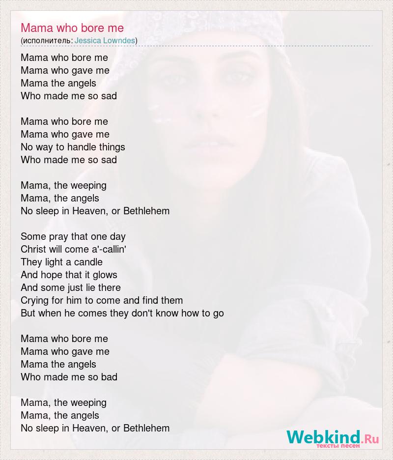 Mama who bore me Mama who gave me Mama the angels Who made me so sad Mama who bore me Mama who gave me No way to handle things Who made me so sad Mama, the weeping Mama, the angels No sleep in Heaven, or Bethlehem Some pray that one day Christ will come a'-callin' They light a candle And hope that it glows And some just lie there Crying for him to come and find them But when he comes they don't know how to go Mama who bore me Mama who gave me Mama the angels Who made me so bad Mama, the weeping Mama, the angels No sleep in Heaven, or Bethlehem
