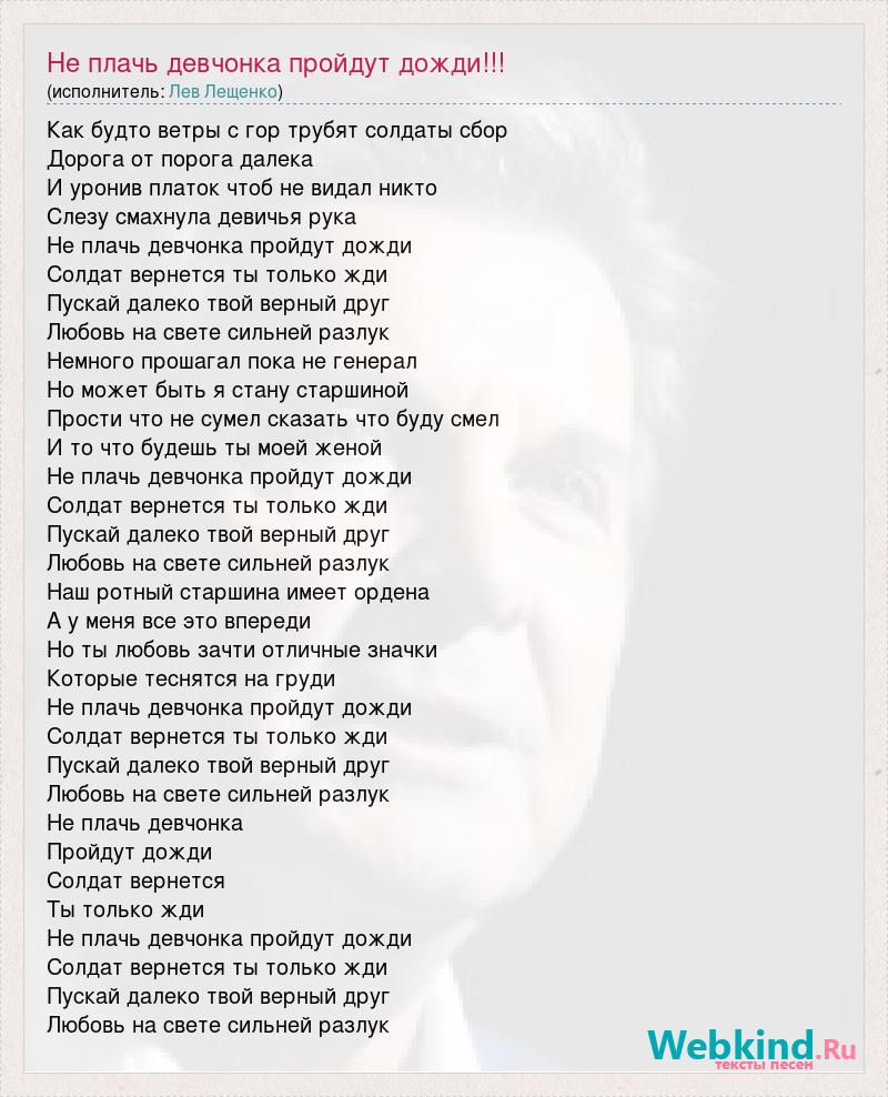 Как будто ветры с гор трубят солдаты сбор Дорога от порога далека И уронив платок чтоб не видал никто Слезу смахнула девичья рука Не плачь девчонка пройдут дожди Солдат вернется ты только жди Пускай далеко твой верный друг Любовь на свете сильней разлук Немного прошагал пока не генерал Но может быть я стану старшиной Прости что не сумел сказать что буду смел И то что будешь ты моей женой Не плачь девчонка пройдут дожди Солдат вернется ты только жди Пускай далеко твой верный друг Любовь на свете сильней разлук Наш ротный старшина имеет ордена А у меня все это впереди Но ты любовь зачти отличные значки Которые теснятся на груди Не плачь девчонка пройдут дожди Солдат вернется ты только жди Пускай далеко твой верный друг Любовь на свете сильней разлук Не плачь девчонка Пройдут дожди Солдат вернется Ты только жди Не плачь девчонка пройдут дожди Солдат вернется ты только жди Пускай далеко твой верный друг Любовь на свете сильней разлук