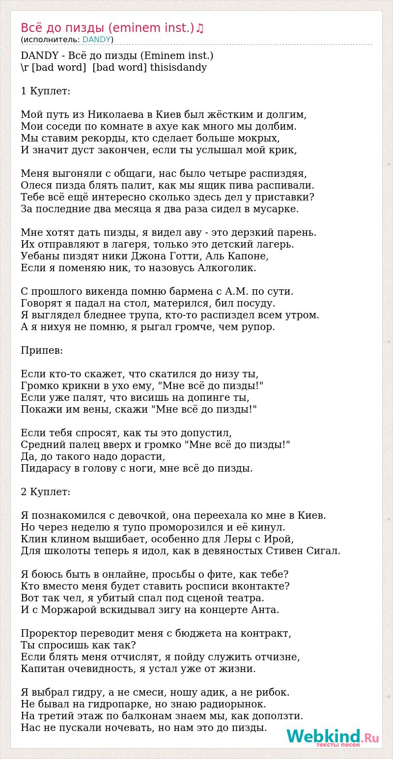DANDY - Всё до пизды (Eminem inst.) \r [bad word] [bad word] thisisdandy 1 Куплет: Мой путь из Николаева в Киев был жёстким и долгим, Мои соседи по комнате в ахуе как много мы долбим. Мы ставим рекорды, кто сделает больше мокрых, И значит дуст закончен, если ты услышал мой крик, Меня выгоняли с общаги, нас было четыре распиздяя, Олеся пизда блять палит, как мы ящик пива распивали. Тебе всё ещё интересно сколько здесь дел у приставки? За последние два месяца я два раза сидел в мусарке. Мне хотят дать пизды, я видел аву - это дерзкий парень. Их отправляют в лагеря, только это детский лагерь. Уебаны пиздят ники Джона Готти, Аль Капоне, Если я поменяю ник, то назовусь Алкоголик. С прошлого викенда помню бармена с А.М. по сути. Говорят я падал на стол, матерился, бил посуду. Я выглядел бледнее трупа, кто-то распиздел всем утром. А я нихуя не помню, я рыгал громче, чем рупор. Припев: Если кто-то скажет, что скатился до низу ты, Громко крикни в ухо ему, "Мне всё до пизды!" Если уже палят, что висишь на допинге ты, Покажи им вены, скажи "Мне всё до пизды!" Если тебя спросят, как ты это допустил, Средний палец вверх и громко "Мне всё до пизды!" Да, до такого надо дорасти, Пидарасу в голову с ноги, мне всё до пизды. 2 Куплет: Я познакомился с девочкой, она переехала ко мне в Киев. Но через неделю я тупо проморозился и её кинул. Клин клином вышибает, особенно для Леры с Ирой, Для школоты теперь я идол, как в девяностых Стивен Сигал. Я боюсь быть в онлайне, просьбы о фите, как тебе? Кто вместо меня будет ставить росписи вконтакте? Вот так чел, я убитый спал под сценой театра. И с Моржарой вскидывал зигу на концерте Анта. Проректор переводит меня с бюджета на контракт, Ты спросишь как так? Если блять меня отчислят, я пойду служить отчизне, Капитан очевидность, я устал уже от жизни. Я выбрал гидру, а не смеси, ношу адик, а не рибок. Не бывал на гидропарке, но знаю радиорынок. На третий этаж по балконам знаем мы, как доползти. Нас не пускали ночевать, но нам это до пизды.