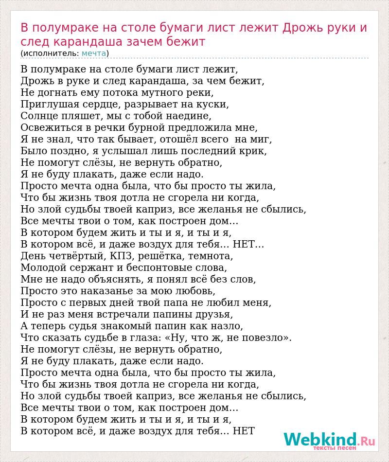 В полумраке на столе бумаги лист лежит, Дрожь в руке и след карандаша, за чем бежит, Не догнать ему потока мутного реки, Приглушая сердце, разрывает на куски, Солнце пляшет, мы с тобой наедине, Освежиться в речки бурной предложила мне, Я не знал, что так бывает, отошёл всего на миг, Было поздно, я услышал лишь последний крик, Не помогут слёзы, не вернуть обратно, Я не буду плакать, даже если надо. Просто мечта одна была, что бы просто ты жила, Что бы жизнь твоя дотла не сгорела ни когда, Но злой судьбы твоей каприз, все желанья не сбылись, Все мечты твои о том, как построен дом… В котором будем жить и ты и я, и ты и я, В котором всё, и даже воздух для тебя… НЕТ… День четвёртый, КПЗ, решётка, темнота, Молодой сержант и беспонтовые слова, Мне не надо объяснять, я понял всё без слов, Просто это наказанье за мою любовь, Просто с первых дней твой папа не любил меня, И не раз меня встречали папины друзья, А теперь судья знакомый папин как назло, Что сказать судьбе в глаза: «Ну, что ж, не повезло». Не помогут слёзы, не вернуть обратно, Я не буду плакать, даже если надо. Просто мечта одна была, что бы просто ты жила, Что бы жизнь твоя дотла не сгорела ни когда, Но злой судьбы твоей каприз, все желанья не сбылись, Все мечты твои о том, как построен дом… В котором будем жить и ты и я, и ты и я, В котором всё, и даже воздух для тебя… НЕТ