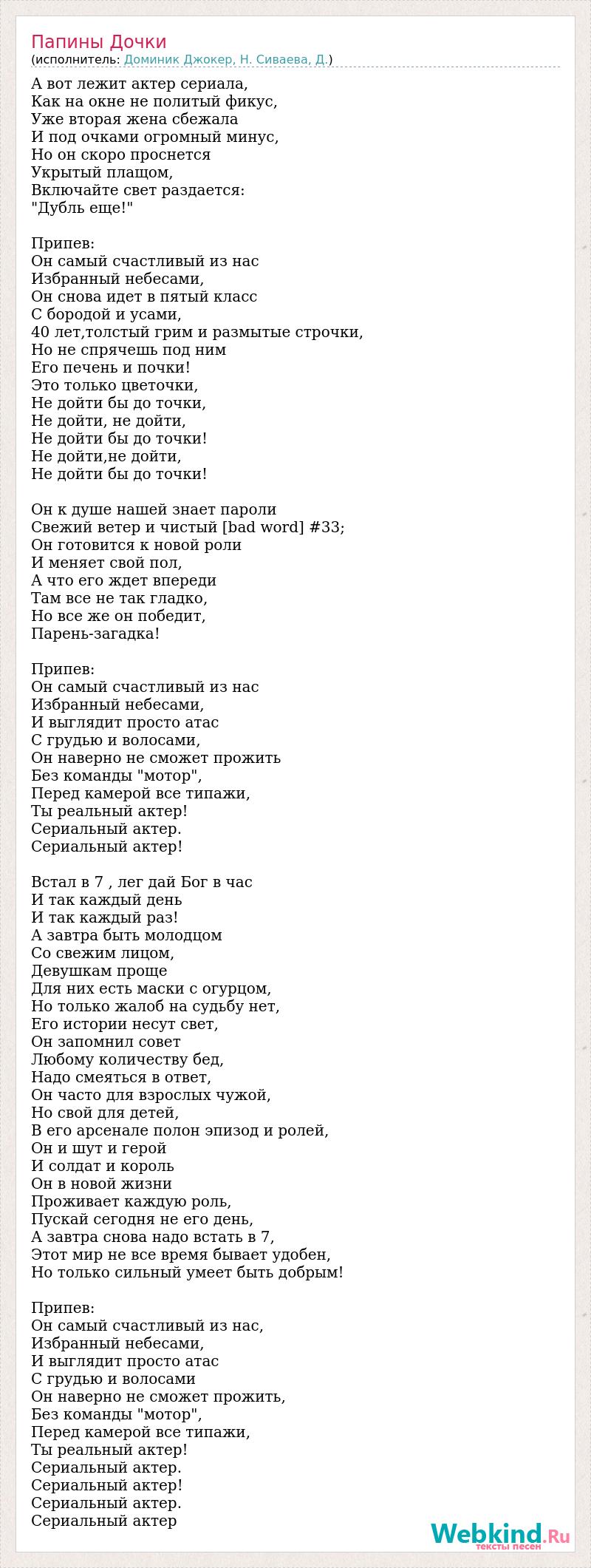 А вот лежит актер сериала, Как на окне не политый фикус, Уже вторая жена сбежала И под очками огромный минус, Но он скоро проснется Укрытый плащом, Включайте свет раздается: "Дубль еще!" Припев: Он самый счастливый из нас Избранный небесами, Он снова идет в пятый класс С бородой и усами, 40 лет,толстый грим и размытые строчки, Но не спрячешь под ним Его печень и почки! Это только цветочки, Не дойти бы до точки, Не дойти, не дойти, Не дойти бы до точки! Не дойти,не дойти, Не дойти бы до точки! Он к душе нашей знает пароли Свежий ветер и чистый [bad word] #33; Он готовится к новой роли И меняет свой пол, А что его ждет впереди Там все не так гладко, Но все же он победит, Парень-загадка! Припев: Он самый счастливый из нас Избранный небесами, И выглядит просто атас С грудью и волосами, Он наверно не сможет прожить Без команды "мотор", Перед камерой все типажи, Ты реальный актер! Сериальный актер. Сериальный актер! Встал в 7 , лег дай Бог в час И так каждый день И так каждый раз! А завтра быть молодцом Со свежим лицом, Девушкам проще Для них есть маски с огурцом, Но только жалоб на судьбу нет, Его истории несут свет, Он запомнил совет Любому количеству бед, Надо смеяться в ответ, Он часто для взрослых чужой, Но свой для детей, В его арсенале полон эпизод и ролей, Он и шут и герой И солдат и король Он в новой жизни Проживает каждую роль, Пускай сегодня не его день, А завтра снова надо встать в 7, Этот мир не все время бывает удобен, Но только сильный умеет быть добрым! Припев: Он самый счастливый из нас, Избранный небесами, И выглядит просто атас С грудью и волосами Он наверно не сможет прожить, Без команды "мотор", Перед камерой все типажи, Ты реальный актер! Сериальный актер. Сериальный актер! Сериальный актер. Сериальный актер