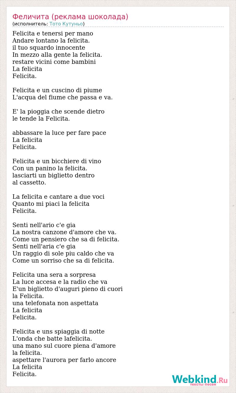 Felicita e tenersi per mano Andare lontano la felicita. il tuo squardo innocente In mezzo alla gente la felicita. restare vicini come bambini La felicita Felicita. Felicita e un cuscino di piume L'acqua del fiume che passa e va. E' la pioggia che scende dietro le tende la Felicita. abbassare la luce per fare pace La felicita Felicita. Felicita e un bicchiere di vino Con un panino la felicita. lasciarti un biglietto dentro al cassetto. La felicita e cantare a due voci Quanto mi piaci la felicita Felicita. Senti nell'ario c'e gia La nostra canzone d'amore che va. Come un pensiero che sa di felicita. Senti nell'aria c'e gia Un raggio di sole piu caldo che va Come un sorriso che sa di felicita. Felicita una sera a sorpresa La luce accesa e la radio che va E'un biglietto d'auguri pieno di cuori la Felicita. una telefonata non aspettata La felicita Felicita. Felicita e uns spiaggia di notte L'onda che batte lafelicita. una mano sul cuore piena d'amore la felicita. aspettare l'aurora per farlo ancore La felicita Felicita.