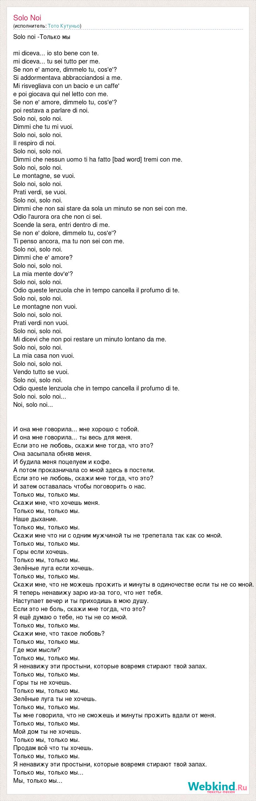 Solo noi -Только мы mi diceva... io sto bene con te. mi diceva... tu sei tutto per me. Se non e' amore, dimmelo tu, cos'e'? Si addormentava abbracciandosi a me. Mi risvegliava con un bacio e un caffe' e poi giocava qui nel letto con me. Se non e' amore, dimmelo tu, cos'e'? poi restava a parlare di noi. Solo noi, solo noi. Dimmi che tu mi vuoi. Solo noi, solo noi. Il respiro di noi. Solo noi, solo noi. Dimmi che nessun uomo ti ha fatto [bad word] tremi con me. Solo noi, solo noi. Le montagne, se vuoi. Solo noi, solo noi. Prati verdi, se vuoi. Solo noi, solo noi. Dimmi che non sai stare da sola un minuto se non sei con me. Odio l'aurora ora che non ci sei. Scende la sera, entri dentro di me. Se non e' dolore, dimmelo tu, cos'e'? Ti penso ancora, ma tu non sei con me. Solo noi, solo noi. Dimmi che e' amore? Solo noi, solo noi. La mia mente dov'e'? Solo noi, solo noi. Odio queste lenzuola che in tempo cancella il profumo di te. Solo noi, solo noi. Le montagne non vuoi. Solo noi, solo noi. Prati verdi non vuoi. Solo noi, solo noi. Mi dicevi che non poi restare un minuto lontano da me. Solo noi, solo noi. La mia casa non vuoi. Solo noi, solo noi. Vendo tutto se vuoi. Solo noi, solo noi. Odio queste lenzuola che in tempo cancella il profumo di te. Solo noi. solo noi... Noi, solo noi... И она мне говорила... мне хорошо с тобой. И она мне говорила... ты весь для меня. Если это не любовь, скажи мне тогда, что это? Она засыпала обняв меня. И будила меня поцелуем и кофе. А потом проказничала со мной здесь в постели. Если это не любовь, скажи мне тогда, что это? И затем оставалась чтобы поговорить о нас. Только мы, только мы. Скажи мне, что хочешь меня. Только мы, только мы. Наше дыхание. Только мы, только мы. Скажи мне что ни с одним мужчиной ты не трепетала так как со мной. Только мы, только мы. Горы если хочешь. Только мы, только мы. Зелёные луга если хочешь. Только мы, только мы. Скажи мне, что не можешь прожить и минуты в одиночестве если ты не со мной. Я теперь ненавижу зарю из-за того, что нет тебя. Наступает вечер и ты приходишь в мою душу. Если это не боль, скажи мне тогда, что это? Я ещё думаю о тебе, но ты не со мной. Только мы, только мы. Скажи мне, что такое любовь? Только мы, только мы. Где мои мысли? Только мы, только мы. Я ненавижу эти простыни, которые вовремя стирают твой запах. Только мы, только мы. Горы ты не хочешь. Только мы, только мы. Зелёные луга ты не хочешь. Только мы, только мы. Ты мне говорила, что не сможешь и минуты прожить вдали от меня. Только мы, только мы. Мой дом ты не хочешь. Только мы, только мы. Продам всё что ты хочешь. Только мы, только мы. Я ненавижу эти простыни, которые вовремя стирают твой запах. Только мы, только мы... Мы, только мы...