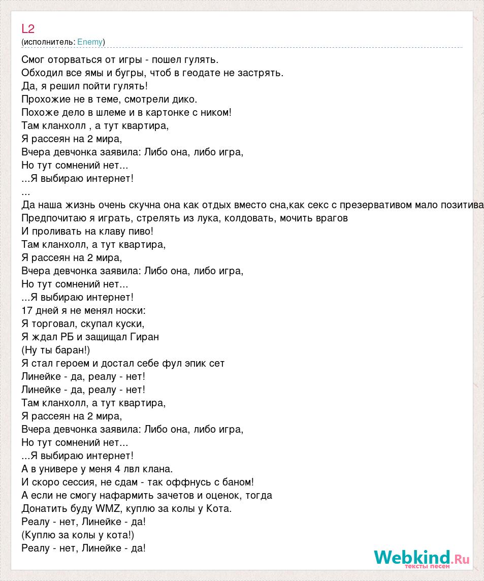 Смог оторваться от игры - пошел гулять. Обходил все ямы и бугры, чтоб в геодате не застрять. Да, я решил пойти гулять! Прохожие не в теме, смотрели дико. Похоже дело в шлеме и в картонке с ником! Там кланхолл , а тут квартира, Я рассеян на 2 мира, Вчера девчонка заявила: Либо она, либо игра, Но тут сомнений нет... ...Я выбираю интернет! ... Да наша жизнь очень скучна она как отдых вместо сна,как секс с презервативом мало позитива Предпочитаю я играть, стрелять из лука, колдовать, мочить врагов И проливать на клаву пиво! Там кланхолл, а тут квартира, Я рассеян на 2 мира, Вчера девчонка заявила: Либо она, либо игра, Но тут сомнений нет... ...Я выбираю интернет! 17 дней я не менял носки: Я торговал, скупал куски, Я ждал РБ и защищал Гиран (Ну ты баран!) Я стал героем и достал себе фул эпик сет Линейке - да, реалу - нет! Линейке - да, реалу - нет! Там кланхолл, а тут квартира, Я рассеян на 2 мира, Вчера девчонка заявила: Либо она, либо игра, Но тут сомнений нет... ...Я выбираю интернет! А в универе у меня 4 лвл клана. И скоро сессия, не сдам - так оффнусь с баном! А если не смогу нафармить зачетов и оценок, тогда Донатить буду WMZ, куплю за колы у Кота. Реалу - нет, Линейке - да! (Куплю за колы у кота!) Реалу - нет, Линейке - да!