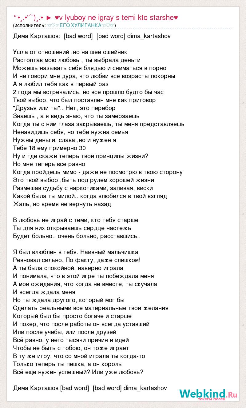 Дима Карташов: [bad word] [bad word] dima_kartashov Ушла от отношений ,но на шее ошейник Растоптав мою любовь , ты выбрала деньги Можешь называть себя блядью и сниматься в порно И не говори мне дура, что любви все возрасты покорны А я любил тебя как в первый раз 2 года мы встречались, но все прошло будто бы час Твой выбор, что был поставлен мне как приговор "Друзья или ты".. Нет, это перебор Знаешь , а я ведь знаю, что ты замерзаешь Когда ты с ним глаза закрываешь, ты меня представляешь Ненавидишь себя, но тебе нужна семья Нужны деньги, слава ,но и нужен я Тебе 18 ему примерно 30 Ну и где скажи теперь твои принципы жизни? Но мне теперь все равно Когда пройдешь мимо - даже не посмотрю в твою сторону Это твой выбор ,быть под рулем хорошей жизни Размешав судьбу с наркотиками, запивая, виски Какой была ты милой.. когда влюбился в твой взгляд Жаль, но время не вернуть назад В любовь не играй с теми, кто тебя старше Ты для них открываешь сердце настежь Будет больно.. очень больно, расставшись.. Я был влюблен в тебя. Наивный мальчишка Ревновал сильно. По факту, даже слишком! А ты была спокойной, наверно играла И понимала, что в этой игре ты побеждала меня А мои ожидания, что когда не вместе, ты скучала И всегда ждала меня Но ты ждала другого, который мог бы Сделать реальными все материальные твои желания Который был бы просто богаче и старше И похер, что после работы он всегда уставший Или после учебы, или после друзей Всё равно, у него тысячи причин и идей Чтобы не быть с тобою, он тоже играет В ту же игру, что со мной играла ты когда-то Только теперь ты пешка, а он король Всё еще нужен успешный? Или уже любовь? Дима Карташов [bad word] [bad word] dima_kartashov