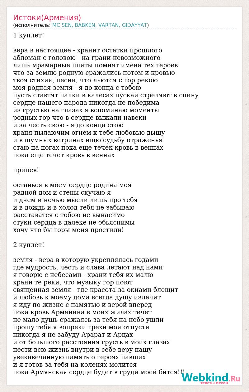1 куплет! вера в настоящее - хранит остатки прошлого абломан с головою - на грани невозможного лишь мрамарные плиты помнят имена тех героев что за землю родную сражались потом и кровью твоя стихия, песни, что льются с гор рекою моя родная земля - я до конца с тобою пусть ставтят палки в калесах пускай стреляют в спину сердце нашего народа никогда не победима из грустью на глазах я вспоминаю моменты родных гор что в сердце выжали навеки и за честь свою - я до конца стою храня пылаючим огнем к тебе любовью дышу и в шумных ветринах ищю судьбу отраженья стаю на ногах пока еще течек кровь в веннах пока еще течет кровь в веннах припев! останься в моем сердце родина моя радной дом и стены скучаю я и днем и ночью мысли лишь про тебя и в дождь и в холод тебя не забываю расставатся с тобою не вынасимо стуки сердца в далеке не обьяснимы хочу что бы горы меня простили! 2 куплет! земля - вера в которую укреплялась годами где мудрость, честь и слава летают над нами я говорю с небесами - храни тебя их малю храни те реки, что музыку гор поют священная земля - где красота за окнами блещит и любовь к моему дома всегда душу излечит я иду по жизне с памятью и верой вперед пока кровь Армянина в моих жилах течет не мало душь сражаясь за тебя на небо ушли прошу тебя я вопреки грехи мои отпусти никогда я не забуду Арарат и Арцах и от большого расстояния грусть в моих глазах нести всю жизнь внутри в себе веру нашу увекавечанную память о героях павших и я готов за тебя на коленях молится пока Армянская сердце будет в груди моей бится!!!