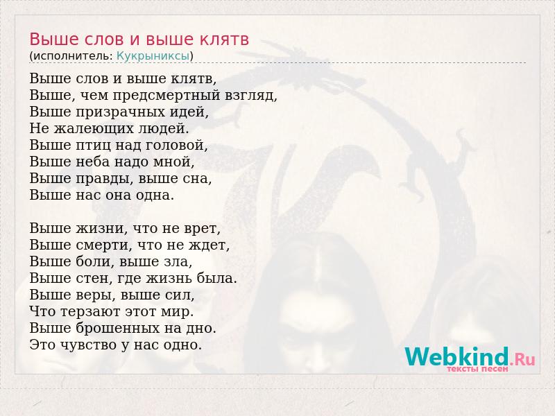 Выше слов и выше клятв, Выше, чем предсмертный взгляд, Выше призрачных идей, Не жалеющих людей. Выше птиц над головой, Выше неба надо мной, Выше правды, выше сна, Выше нас она одна. Выше жизни, что не врет, Выше смерти, что не ждет, Выше боли, выше зла, Выше стен, где жизнь была. Выше веры, выше сил, Что терзают этот мир. Выше брошенных на дно. Это чувство у нас одно.