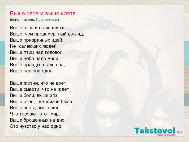 Выше слов и выше клятв, Выше, чем предсмертный взгляд, Выше призрачных идей, Не жалеющих людей. Выше птиц над головой, Выше неба надо мной, Выше правды, выше сна, Выше нас она одна. Выше жизни, что не врет, Выше смерти, что не ждет, Выше боли, выше зла, Выше стен, где жизнь была. Выше веры, выше сил, Что терзают этот мир. Выше брошенных на дно. Это чувство у нас одно.