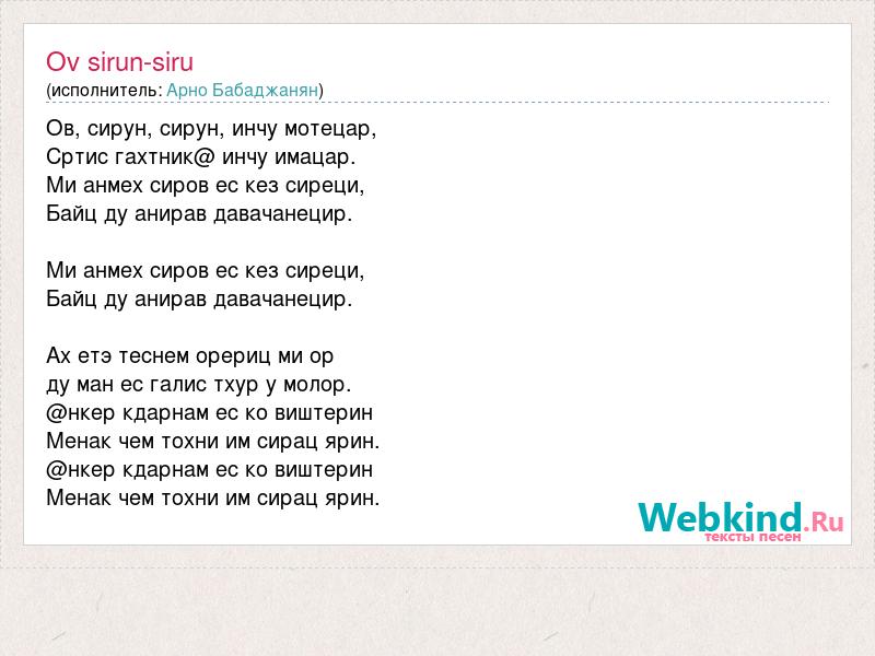 Ов, сирун, сирун, инчу мотецар, Сртис гахтник@ инчу имацар. Ми анмех сиров ес кез сиреци, Байц ду анирав давачанецир. Ми анмех сиров ес кез сиреци, Байц ду анирав давачанецир. Ах етэ теснем орериц ми ор ду ман ес галис тхур у молор. @нкер кдарнам ес ко виштерин Менак чем тохни им сирац ярин. @нкер кдарнам ес ко виштерин Менак чем тохни им сирац ярин.