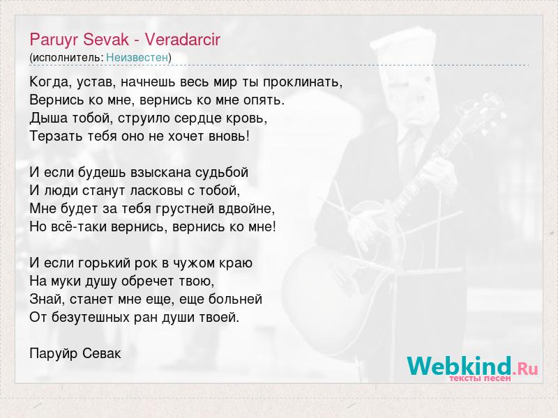 Когда, устав, начнешь весь мир ты проклинать, Вернись ко мне, вернись ко мне опять. Дыша тобой, струило сердце кровь, Терзать тебя оно не хочет вновь! И если будешь взыскана судьбой И люди станут ласковы с тобой, Мне будет за тебя грустней вдвойне, Но всё-таки вернись, вернись ко мне! И если горький рок в чужом краю На муки душу обречет твою, Знай, станет мне еще, еще больней От безутешных ран души твоей. Паруйр Севак