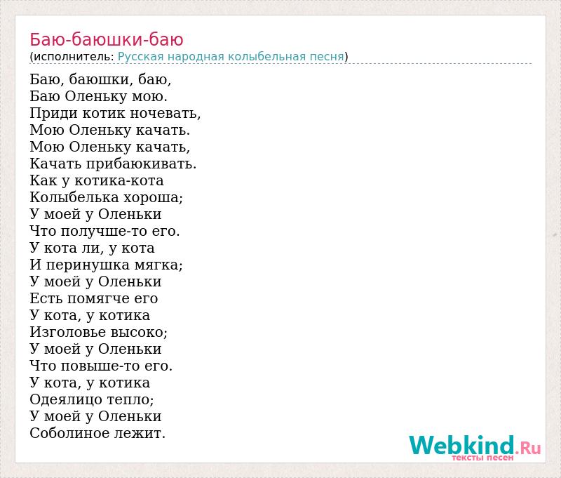 Баю, баюшки, баю, Баю Оленьку мою. Приди котик ночевать, Мою Оленьку качать. Мою Оленьку качать, Качать прибаюкивать. Как у котика-кота Колыбелька хороша; У моей у Оленьки Что получше-то его. У кота ли, у кота И перинушка мягка; У моей у Оленьки Есть помягче его У кота, у котика Изголовье высоко; У моей у Оленьки Что повыше-то его. У кота, у котика Одеялицо тепло; У моей у Оленьки Соболиное лежит.