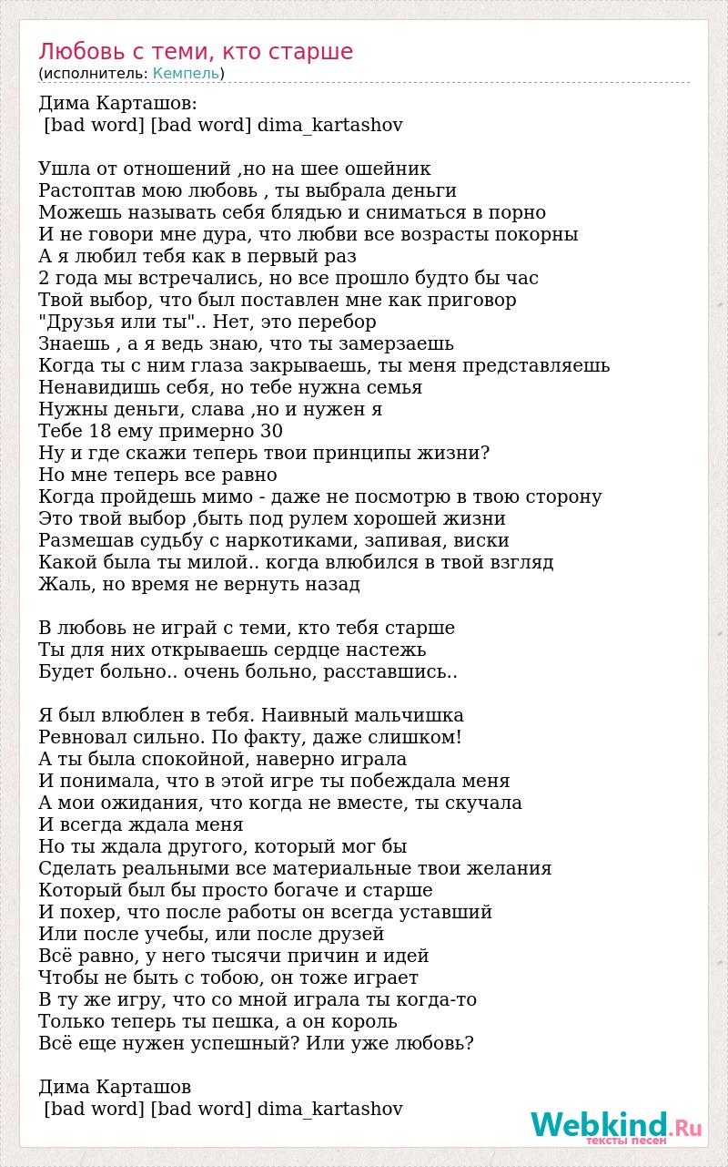 Дима Карташов: [bad word] [bad word] dima_kartashov Ушла от отношений ,но на шее ошейник Растоптав мою любовь , ты выбрала деньги Можешь называть себя блядью и сниматься в порно И не говори мне дура, что любви все возрасты покорны А я любил тебя как в первый раз 2 года мы встречались, но все прошло будто бы час Твой выбор, что был поставлен мне как приговор "Друзья или ты".. Нет, это перебор Знаешь , а я ведь знаю, что ты замерзаешь Когда ты с ним глаза закрываешь, ты меня представляешь Ненавидишь себя, но тебе нужна семья Нужны деньги, слава ,но и нужен я Тебе 18 ему примерно 30 Ну и где скажи теперь твои принципы жизни? Но мне теперь все равно Когда пройдешь мимо - даже не посмотрю в твою сторону Это твой выбор ,быть под рулем хорошей жизни Размешав судьбу с наркотиками, запивая, виски Какой была ты милой.. когда влюбился в твой взгляд Жаль, но время не вернуть назад В любовь не играй с теми, кто тебя старше Ты для них открываешь сердце настежь Будет больно.. очень больно, расставшись.. Я был влюблен в тебя. Наивный мальчишка Ревновал сильно. По факту, даже слишком! А ты была спокойной, наверно играла И понимала, что в этой игре ты побеждала меня А мои ожидания, что когда не вместе, ты скучала И всегда ждала меня Но ты ждала другого, который мог бы Сделать реальными все материальные твои желания Который был бы просто богаче и старше И похер, что после работы он всегда уставший Или после учебы, или после друзей Всё равно, у него тысячи причин и идей Чтобы не быть с тобою, он тоже играет В ту же игру, что со мной играла ты когда-то Только теперь ты пешка, а он король Всё еще нужен успешный? Или уже любовь? Дима Карташов [bad word] [bad word] dima_kartashov