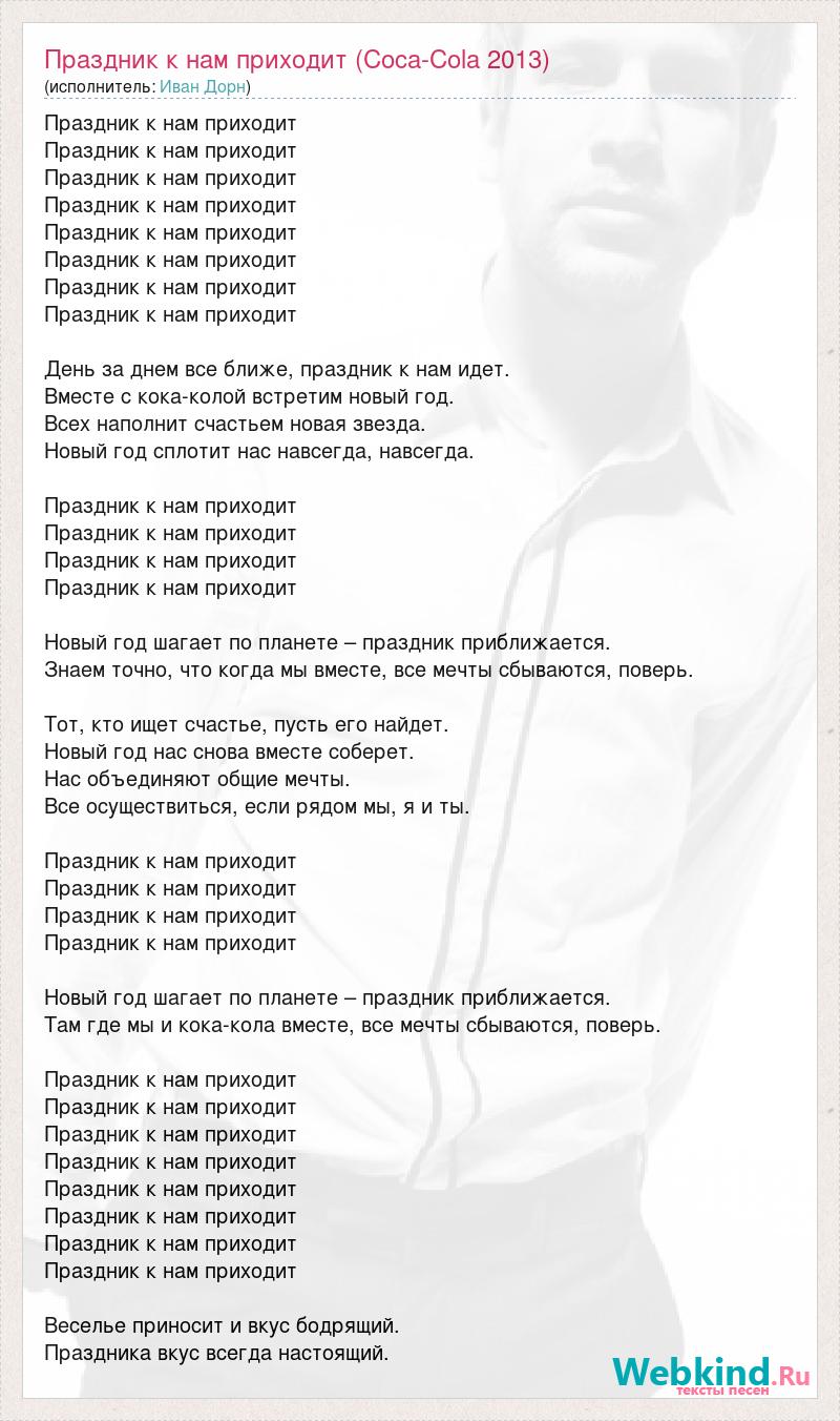 Праздник к нам приходит Праздник к нам приходит Праздник к нам приходит Праздник к нам приходит Праздник к нам приходит Праздник к нам приходит Праздник к нам приходит Праздник к нам приходит День за днем все ближе, праздник к нам идет. Вместе с кока-колой встретим новый год. Всех наполнит счастьем новая звезда. Новый год сплотит нас навсегда, навсегда. Праздник к нам приходит Праздник к нам приходит Праздник к нам приходит Праздник к нам приходит Новый год шагает по планете – праздник приближается. Знаем точно, что когда мы вместе, все мечты сбываются, поверь. Тот, кто ищет счастье, пусть его найдет. Новый год нас снова вместе соберет. Нас объединяют общие мечты. Все осуществиться, если рядом мы, я и ты. Праздник к нам приходит Праздник к нам приходит Праздник к нам приходит Праздник к нам приходит Новый год шагает по планете – праздник приближается. Там где мы и кока-кола вместе, все мечты сбываются, поверь. Праздник к нам приходит Праздник к нам приходит Праздник к нам приходит Праздник к нам приходит Праздник к нам приходит Праздник к нам приходит Праздник к нам приходит Праздник к нам приходит Веселье приносит и вкус бодрящий. Праздника вкус всегда настоящий.