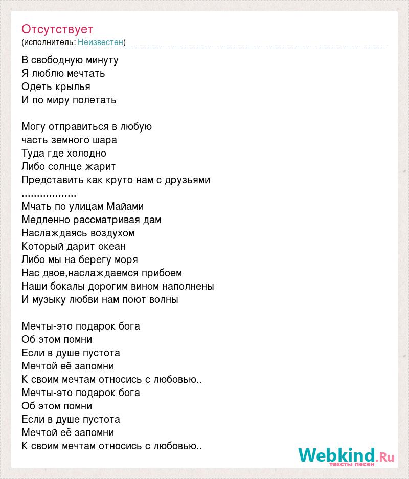 В свободную минуту Я люблю мечтать Одеть крылья И по миру полетать Могу отправиться в любую часть земного шара Туда где холодно Либо солнце жарит Представить как круто нам с друзьями .................. Мчать по улицам Майами Медленно рассматривая дам Наслаждаясь воздухом Который дарит океан Либо мы на берегу моря Нас двое,наслаждаемся прибоем Наши бокалы дорогим вином наполнены И музыку любви нам поют волны Мечты-это подарок бога Об этом помни Если в душе пустота Мечтой её запомни К своим мечтам относись с любовью.. Мечты-это подарок бога Об этом помни Если в душе пустота Мечтой её запомни К своим мечтам относись с любовью..