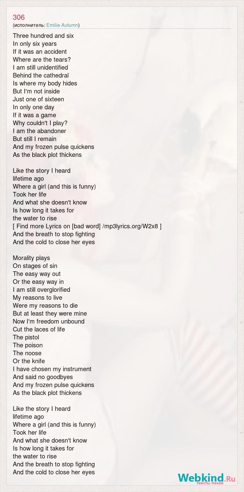 Three hundred and six In only six years If it was an accident Where are the tears? I am still unidentified Behind the cathedral Is where my body hides But I'm not inside Just one of sixteen In only one day If it was a game Why couldn't I play? I am the abandoner But still I remain And my frozen pulse quickens As the black plot thickens Like the story I heard lifetime ago Where a girl (and this is funny) Took her life And what she doesn't know Is how long it takes for the water to rise [ Find more Lyrics on [bad word] /mp3lyrics.org/W2x8 ] And the breath to stop fighting And the cold to close her eyes Morality plays On stages of sin The easy way out Or the easy way in I am still overglorified My reasons to live Were my reasons to die But at least they were mine Now I'm freedom unbound Cut the laces of life The pistol The poison The noose Or the knife I have chosen my instrument And said no goodbyes And my frozen pulse quickens As the black plot thickens Like the story I heard lifetime ago Where a girl (and this is funny) Took her life And what she doesn't know Is how long it takes for the water to rise And the breath to stop fighting And the cold to close her eyes