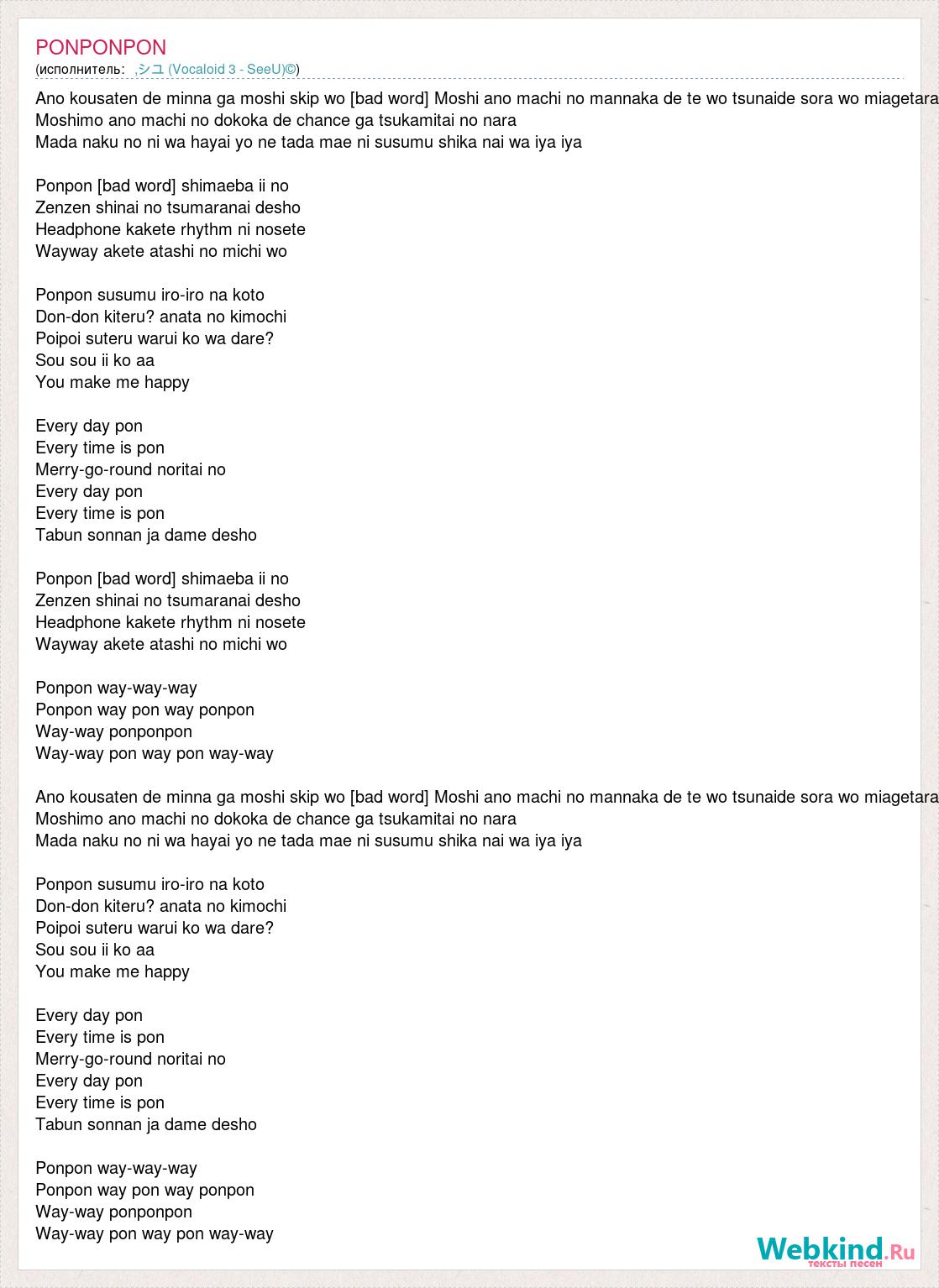 Ano kousaten de minna ga moshi skip wo [bad word] Moshi ano machi no mannaka de te wo tsunaide sora wo miagetara Moshimo ano machi no dokoka de chance ga tsukamitai no nara Mada naku no ni wa hayai yo ne tada mae ni susumu shika nai wa iya iya Ponpon [bad word] shimaeba ii no Zenzen shinai no tsumaranai desho Headphone kakete rhythm ni nosete Wayway akete atashi no michi wo Ponpon susumu iro-iro na koto Don-don kiteru? anata no kimochi Poipoi suteru warui ko wa dare? Sou sou ii ko aa You make me happy Every day pon Every time is pon Merry-go-round noritai no Every day pon Every time is pon Tabun sonnan ja dame desho Ponpon [bad word] shimaeba ii no Zenzen shinai no tsumaranai desho Headphone kakete rhythm ni nosete Wayway akete atashi no michi wo Ponpon way-way-way Ponpon way pon way ponpon Way-way ponponpon Way-way pon way pon way-way Ano kousaten de minna ga moshi skip wo [bad word] Moshi ano machi no mannaka de te wo tsunaide sora wo miagetara Moshimo ano machi no dokoka de chance ga tsukamitai no nara Mada naku no ni wa hayai yo ne tada mae ni susumu shika nai wa iya iya Ponpon susumu iro-iro na koto Don-don kiteru? anata no kimochi Poipoi suteru warui ko wa dare? Sou sou ii ko aa You make me happy Every day pon Every time is pon Merry-go-round noritai no Every day pon Every time is pon Tabun sonnan ja dame desho Ponpon way-way-way Ponpon way pon way ponpon Way-way ponponpon Way-way pon way pon way-way